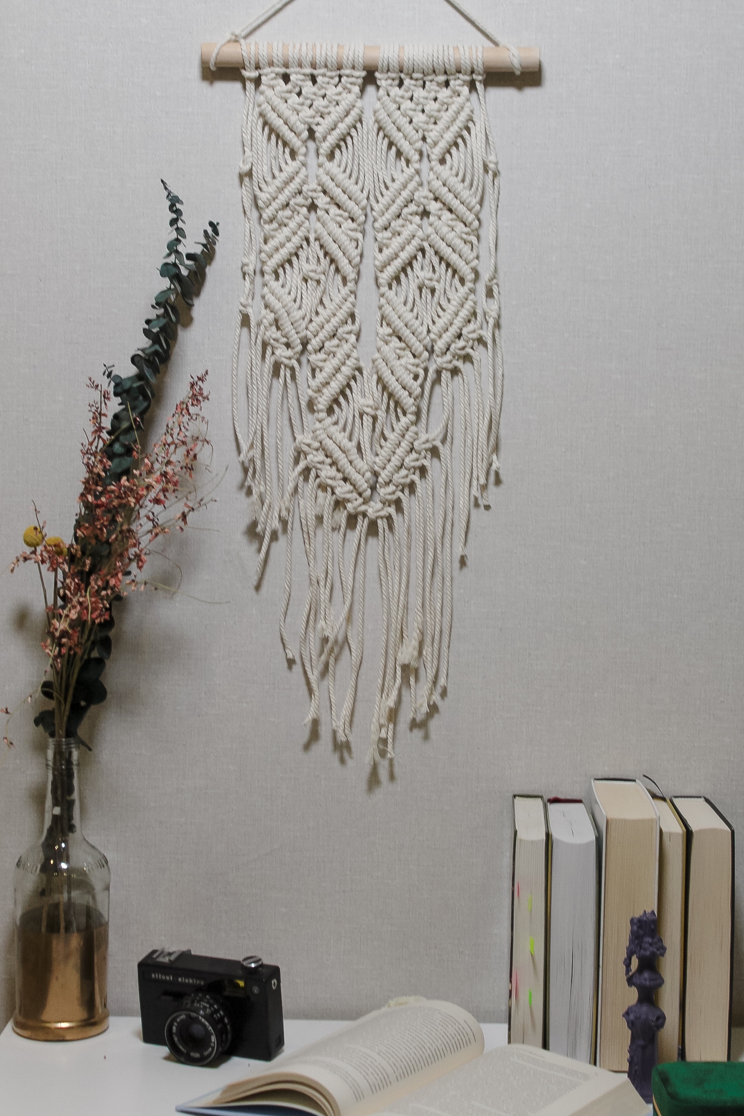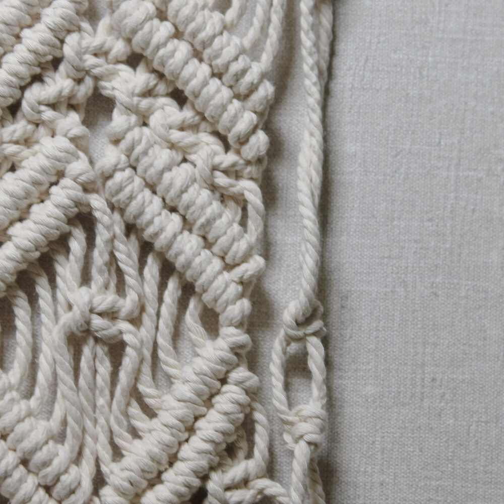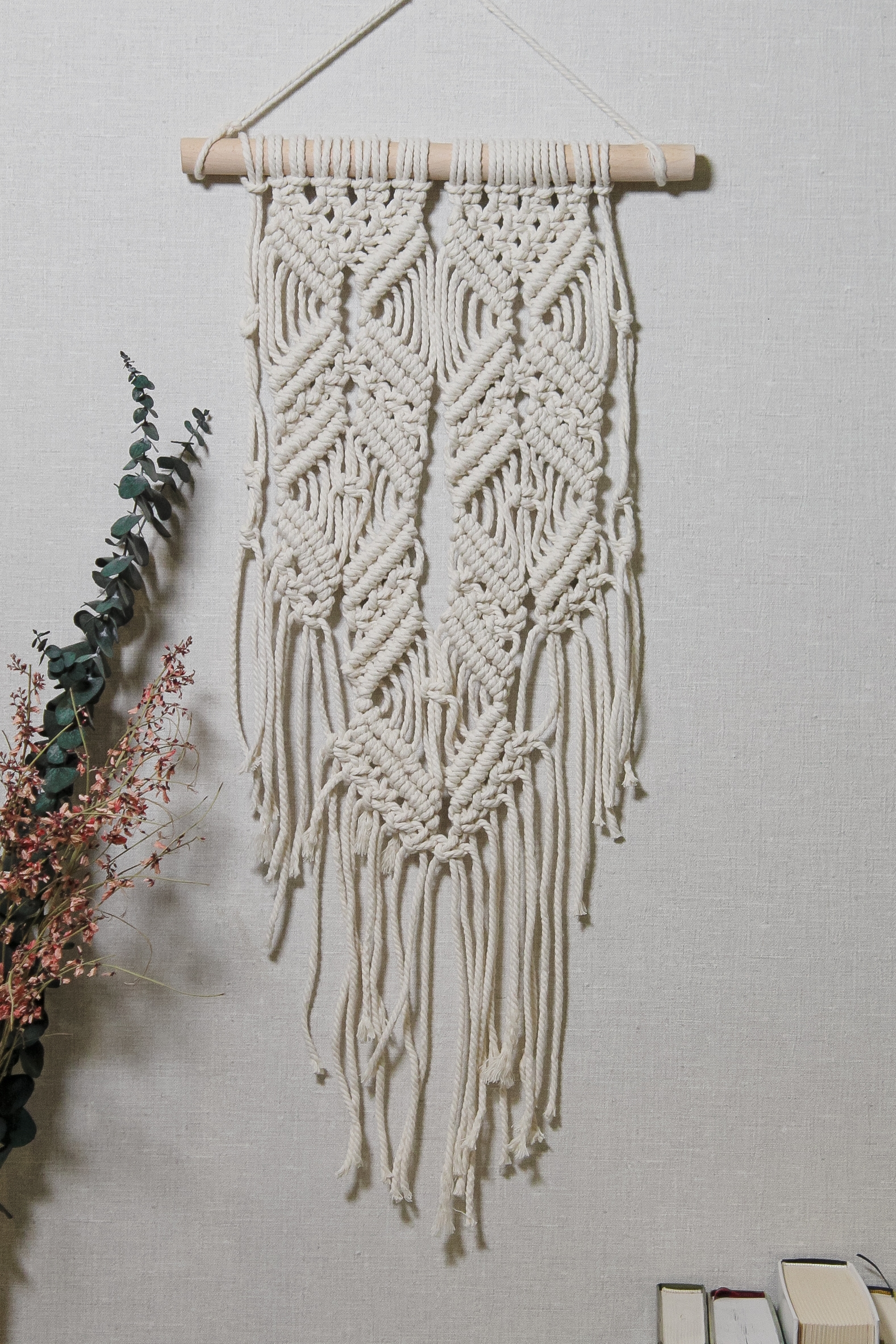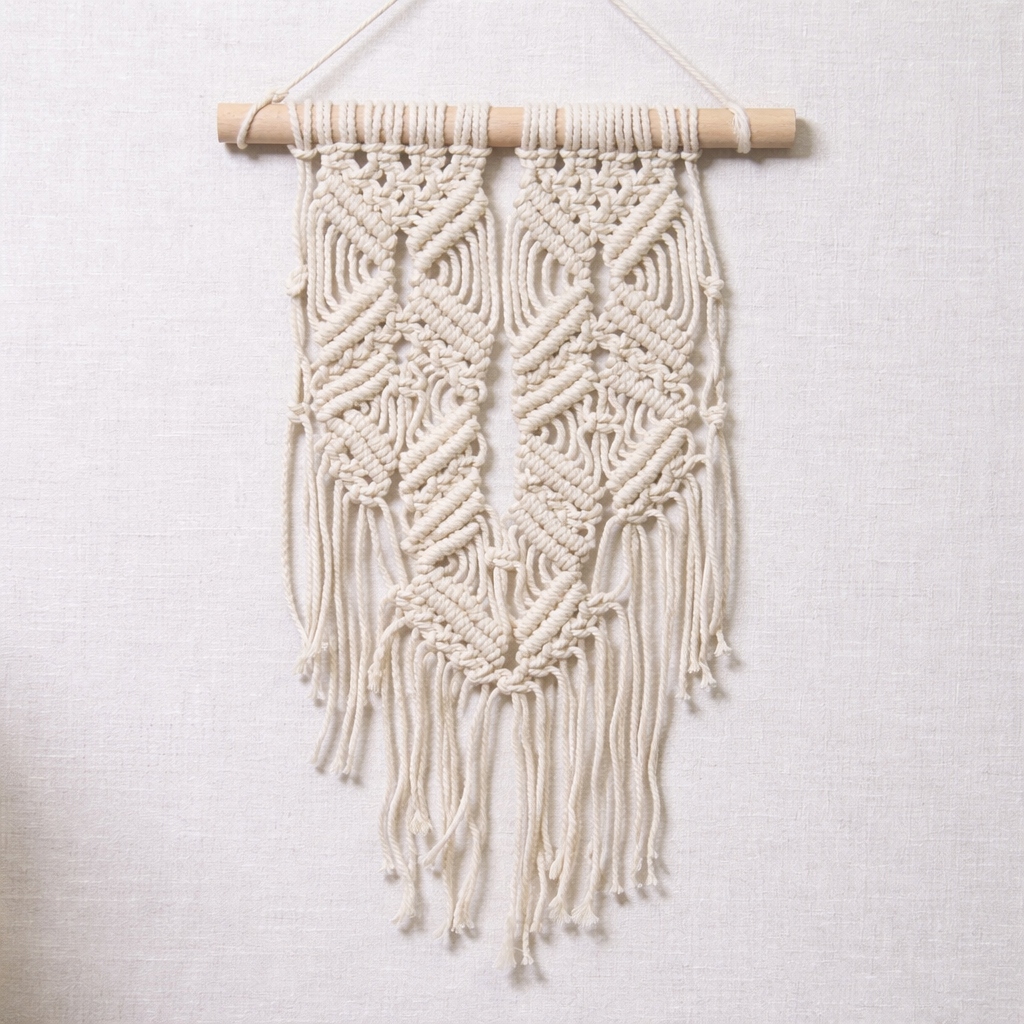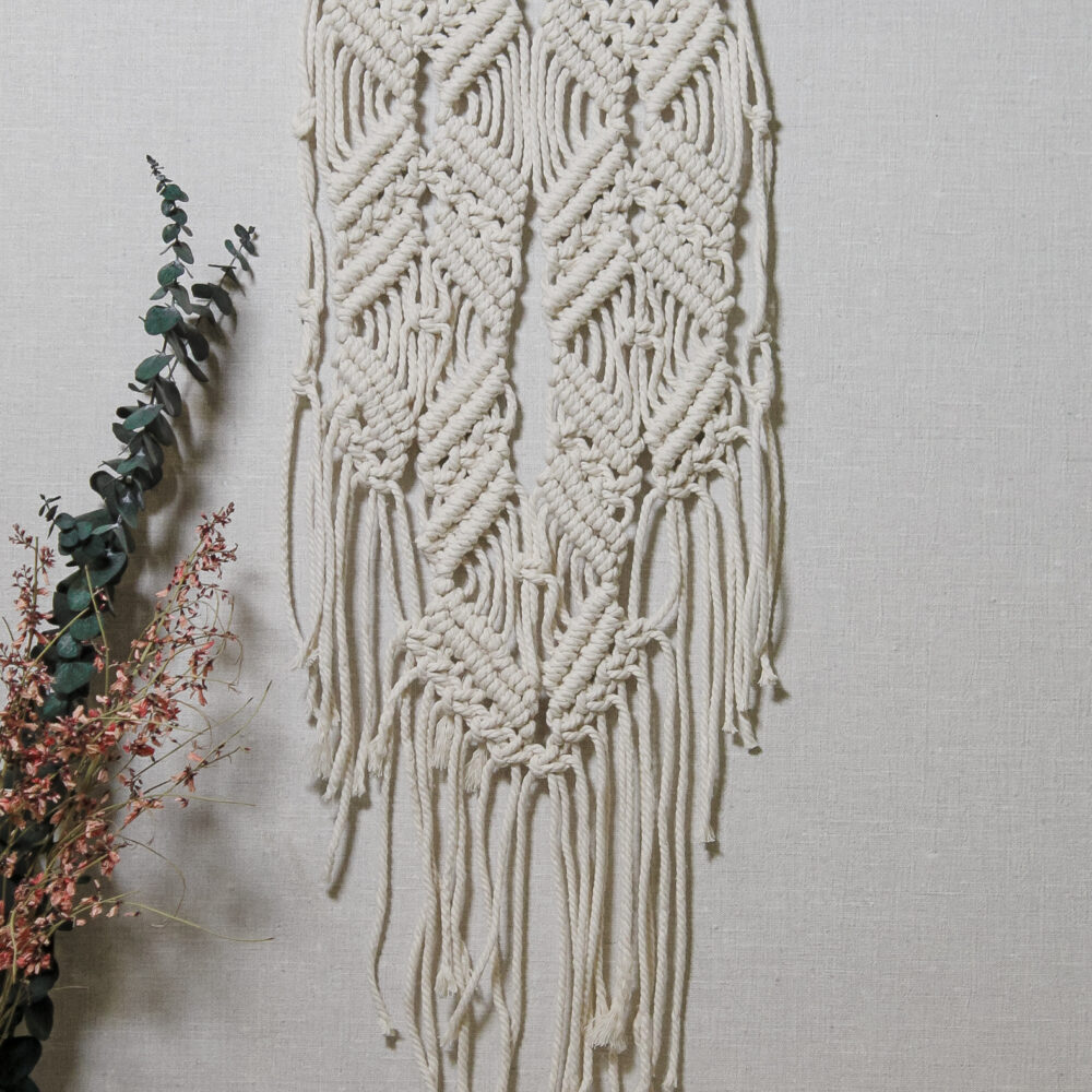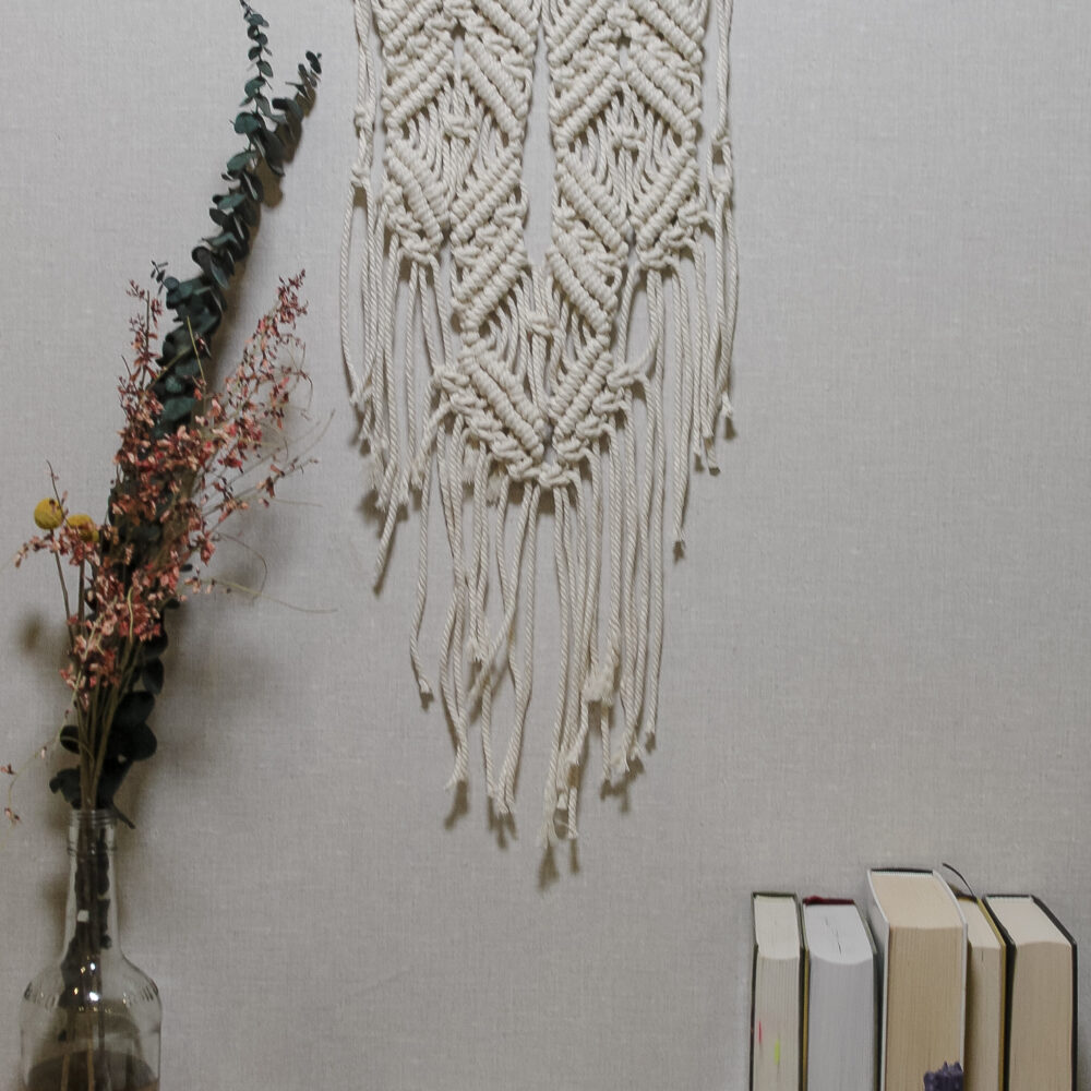 Настінне макраме ручної роботи з натурального бавовняного шнура на дерев’яній гілці. Лаконічне плетіння з довгими шнурами створює спокійний boho-настрій і додає інтер’єру тепла та текстури. Ідеально підходить для спальні, вітальні або затишного куточка для відпочинку.