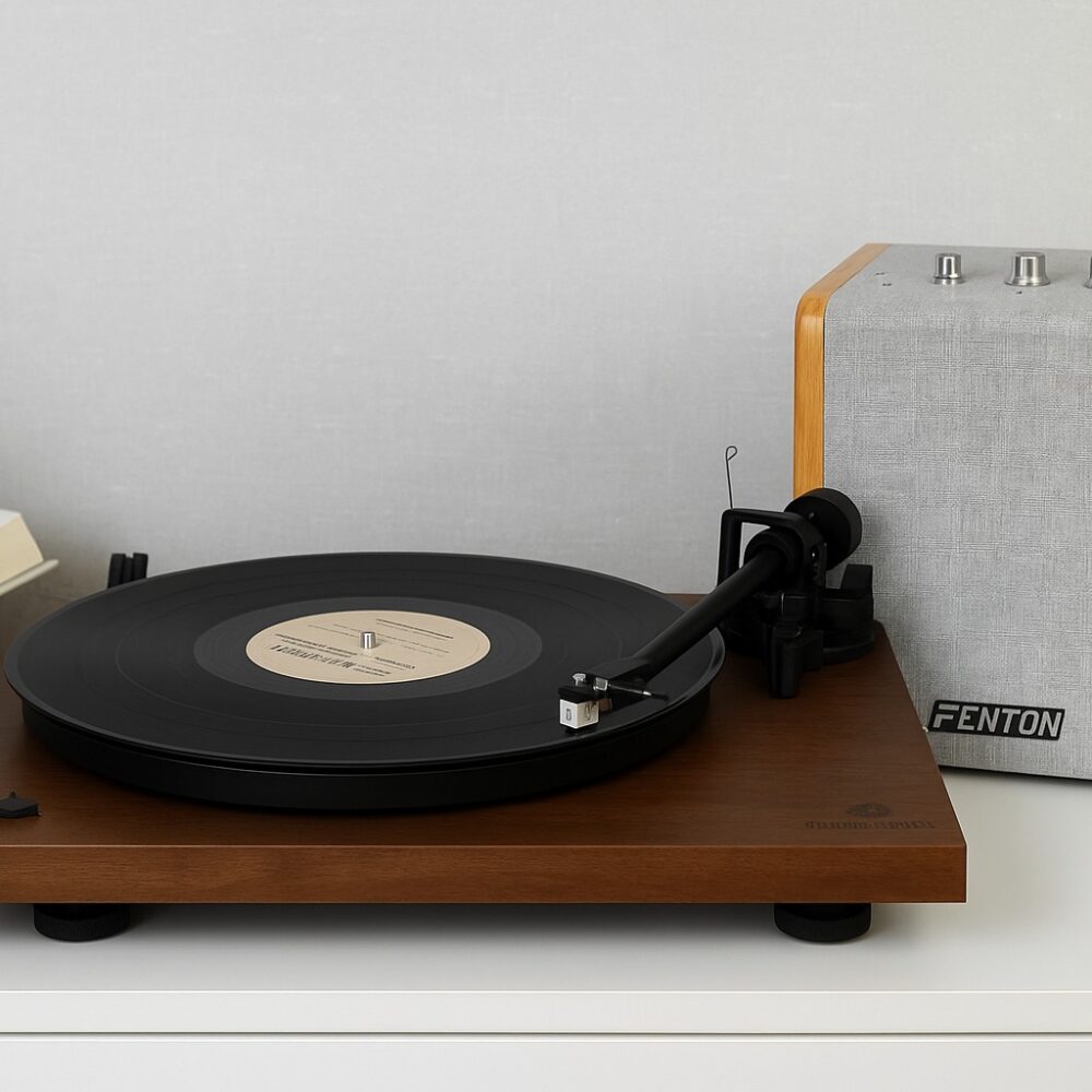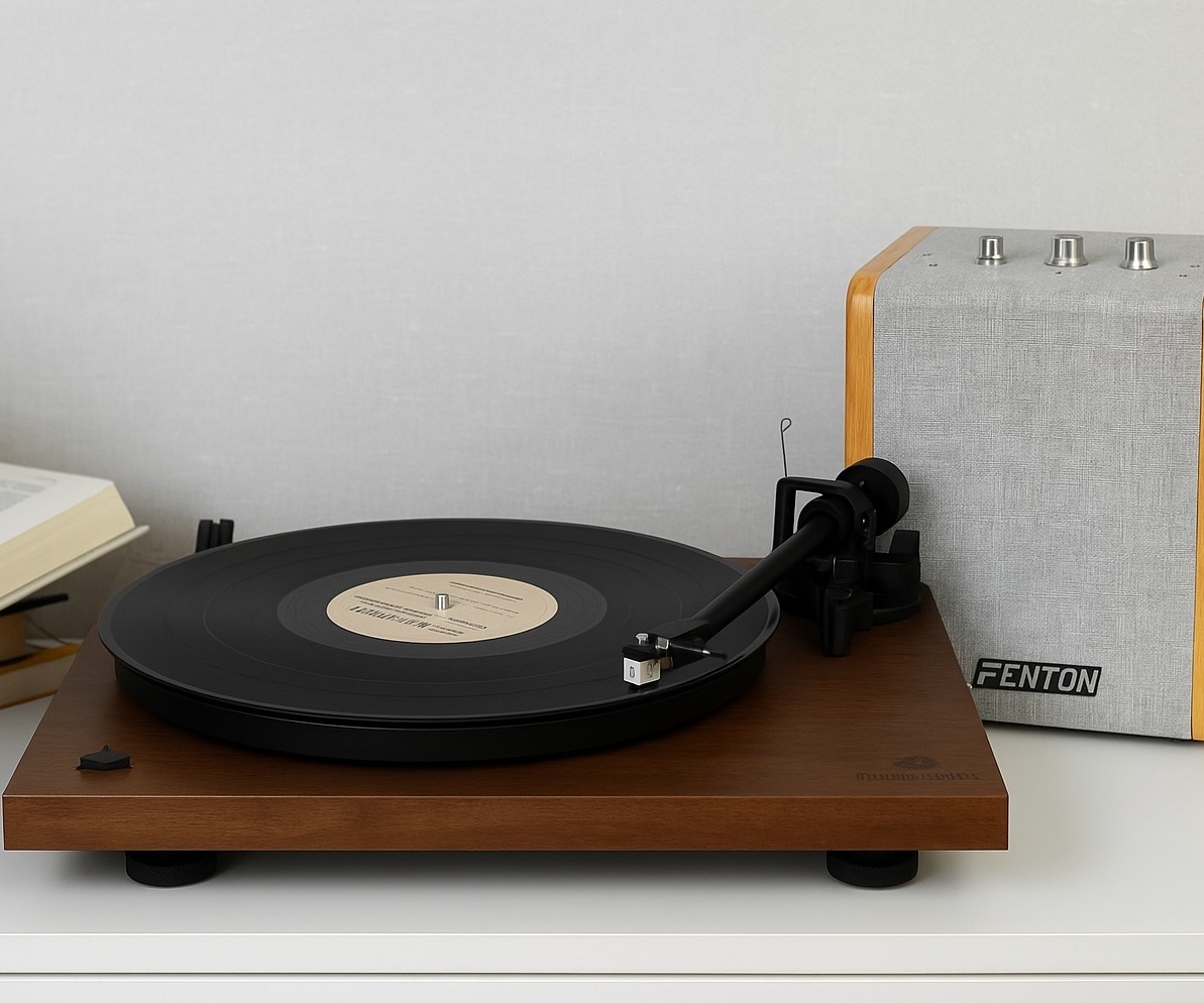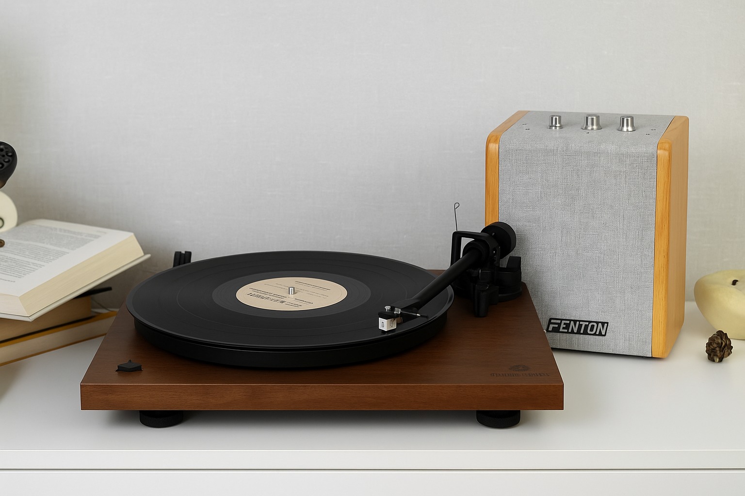 Повноцінний сет-ап: програвач вінілу з можливістю бездротового підключення через Bluetooth до динаміка Fenton, який вже включено до комплекту.