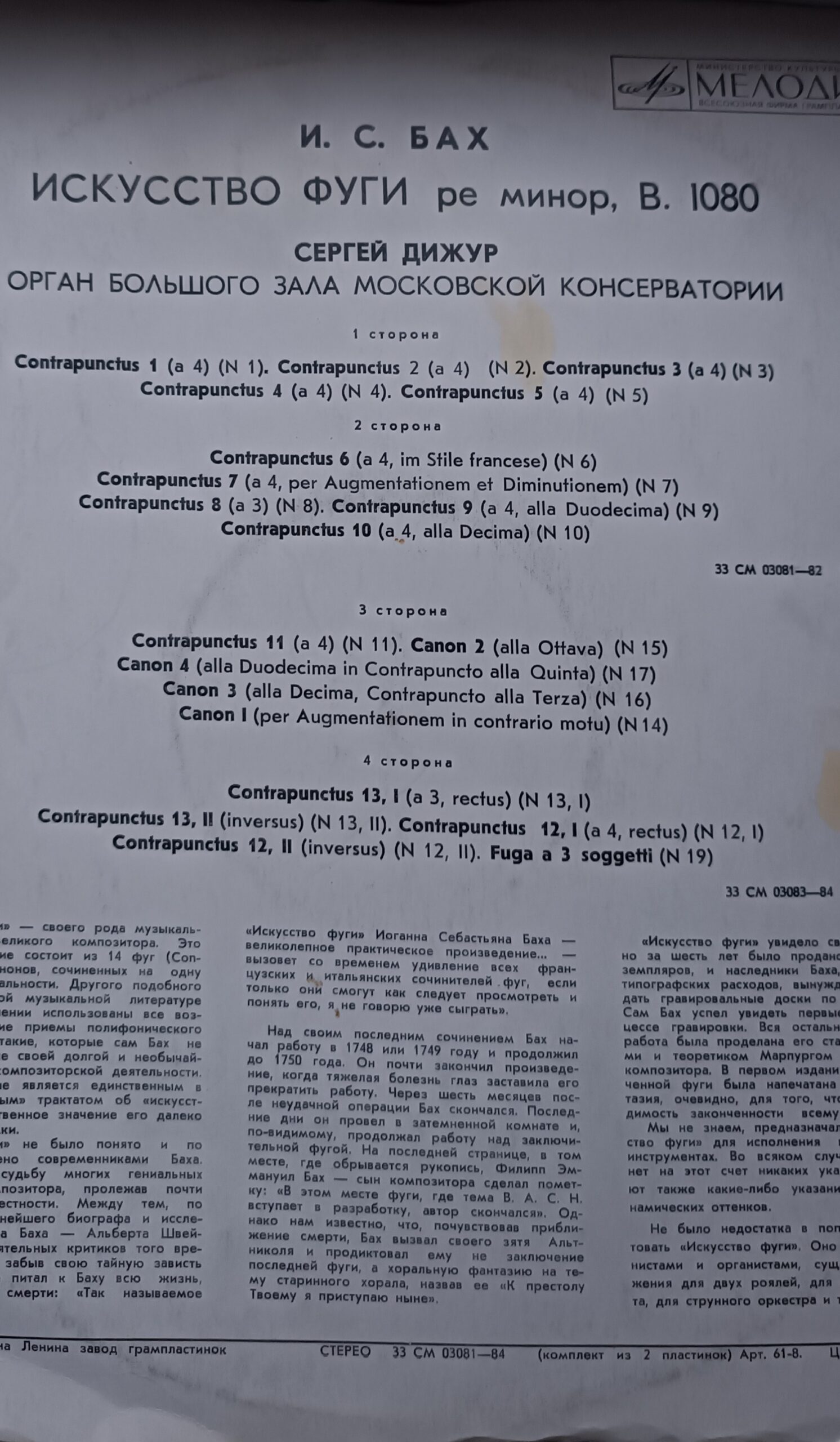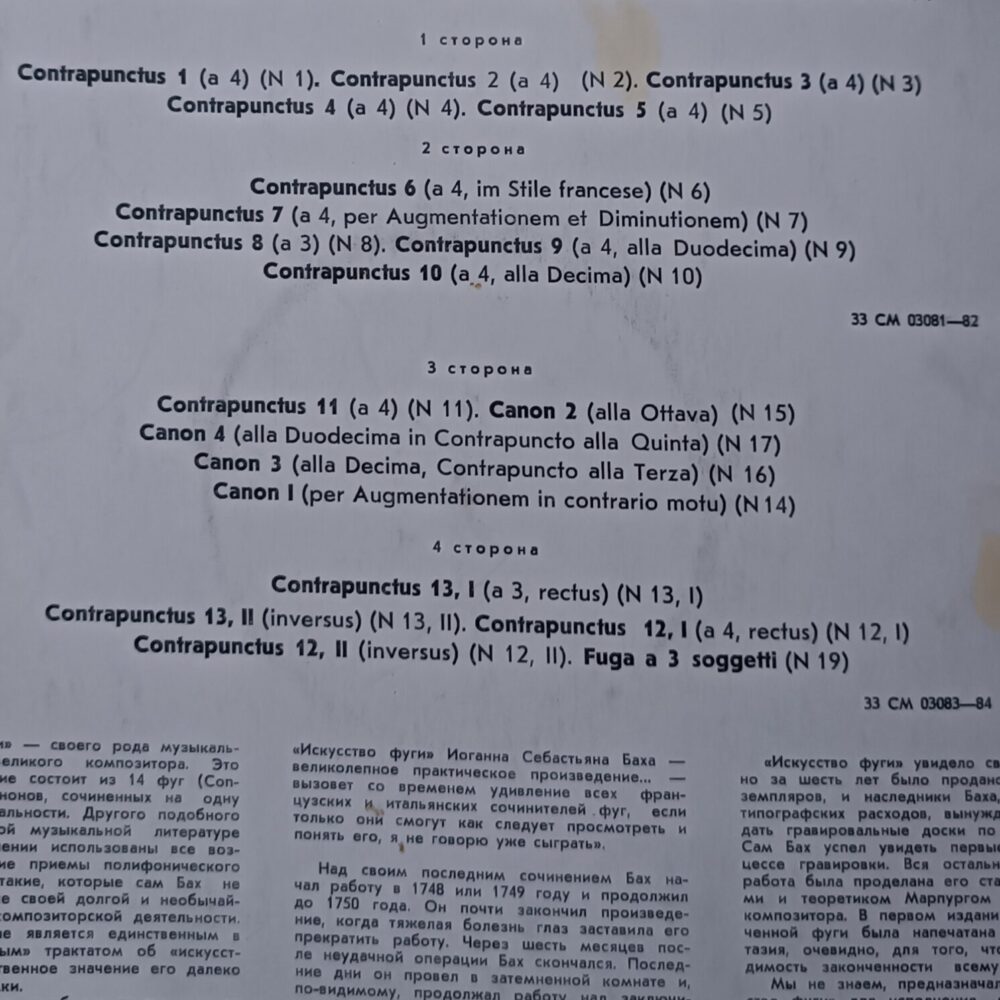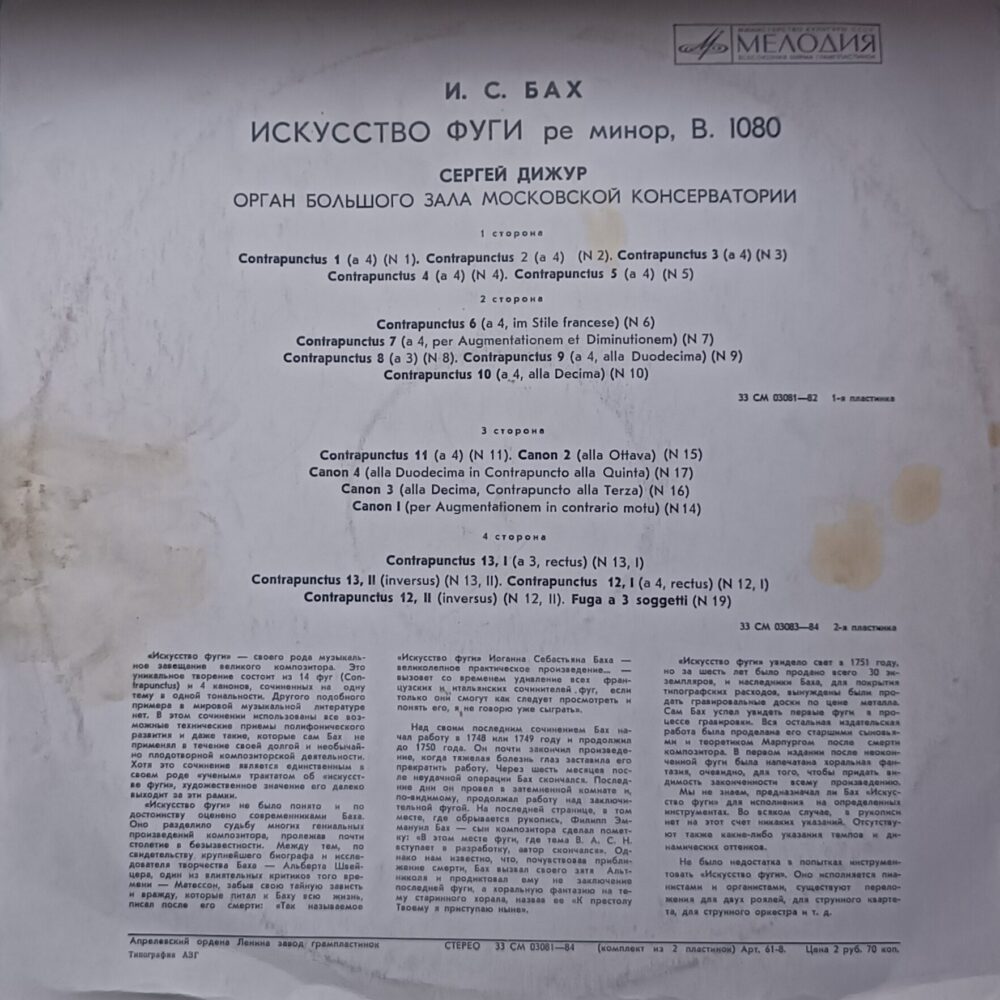 У цьому виданні звучить виконання на органі, що додає музиці монументальності, об’ємного простору та особливого “храмового” характеру. Запис у виконанні Сергія Діжура передає холодну архітектуру тем та потужну логіку бахівської композиції — ідеальна платівка для поціновувачів класики та органного звучання.