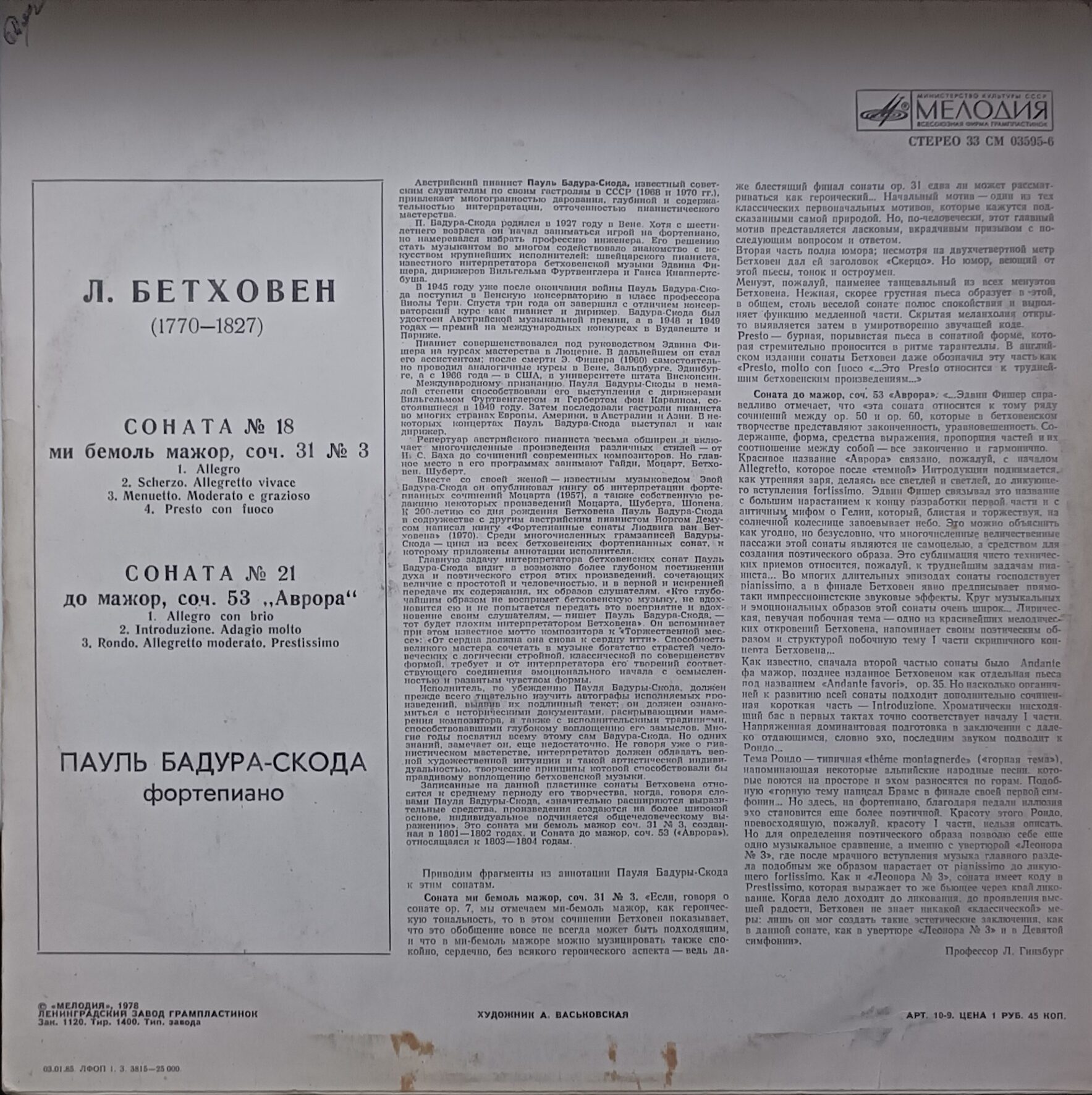 Вінілова платівка з двома знаковими сонатами Бетховена у виконанні видатного піаніста Paul Badura-Skoda. У збірці поєднано контрастні за характером твори: енергійну та драматичну Sonata No. 18, а також легендарну Sonata No. 21 “Aurora”, відому своєю величною мелодикою та яскравою динамікою. Чудовий вибір для поціновувачів класичної фортепіанної музики та колекціонерів вінілових видань.
