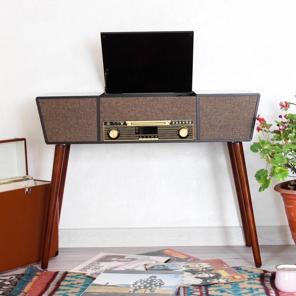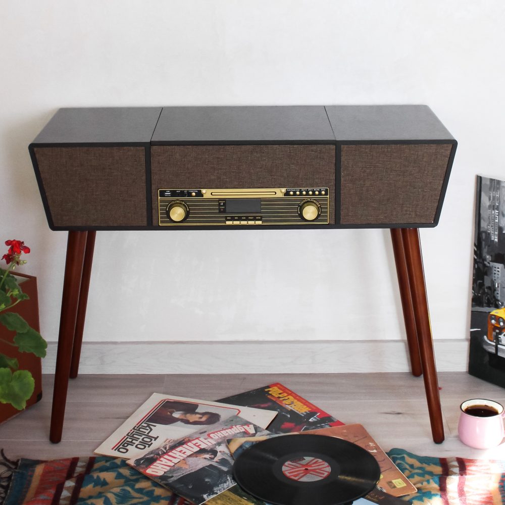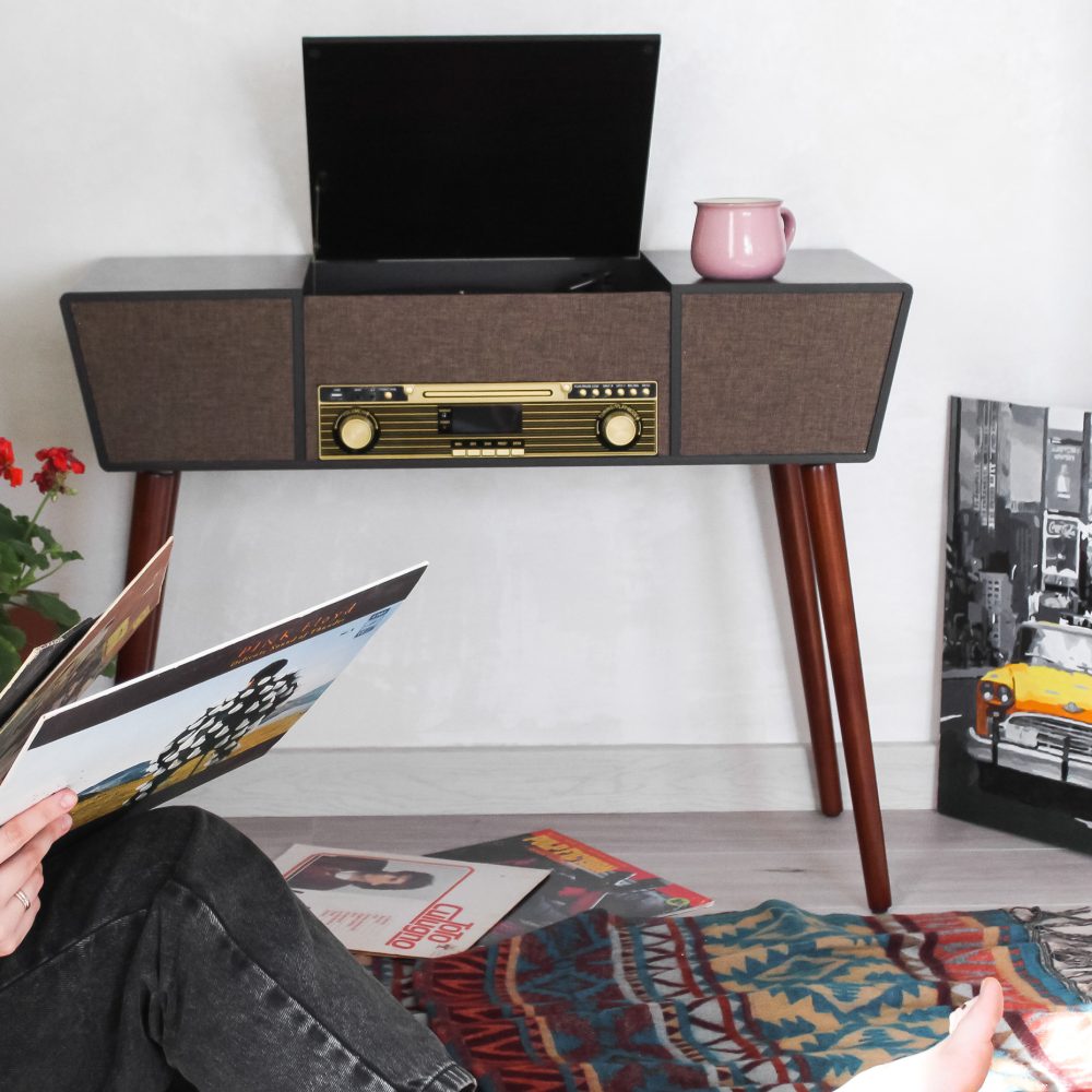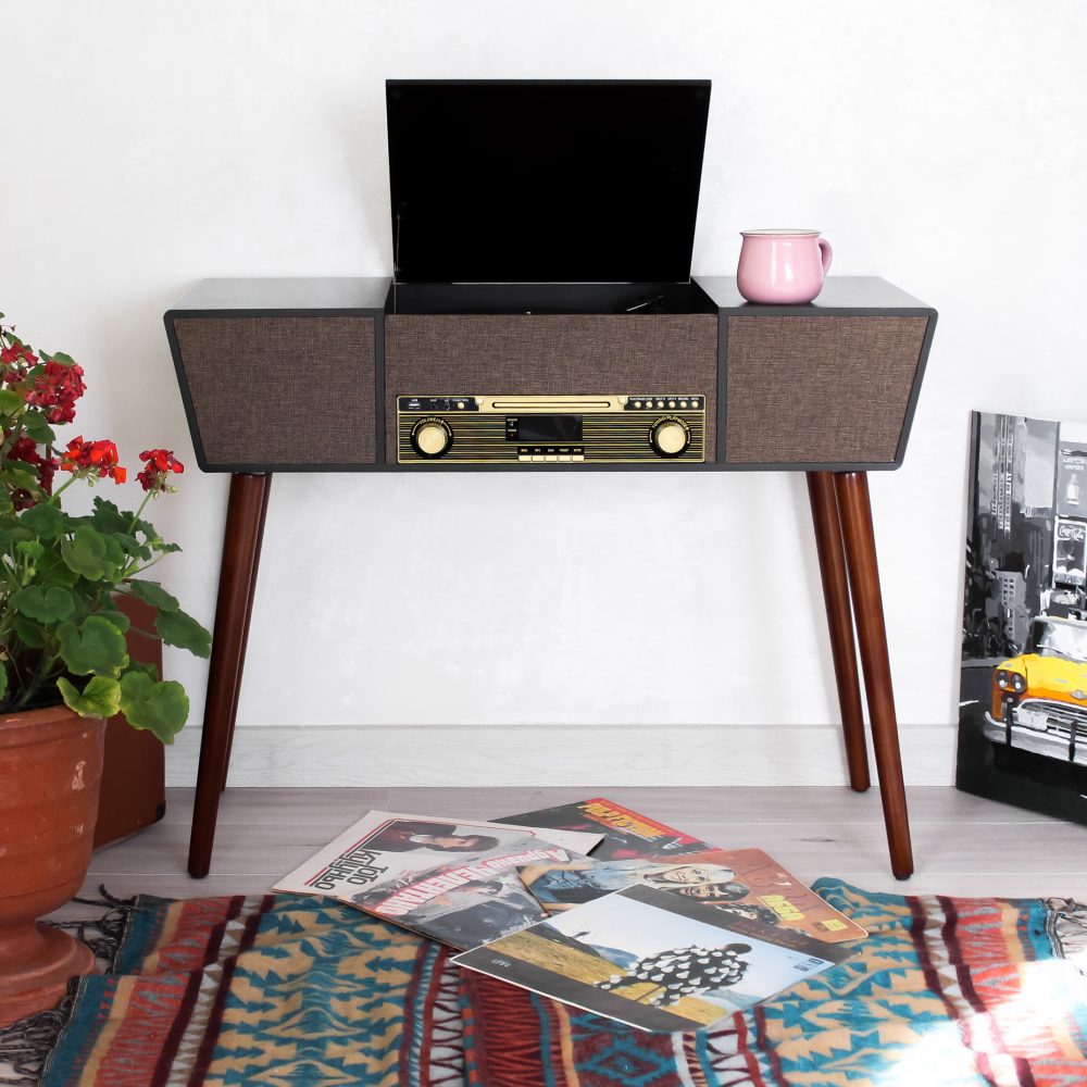 Auna Belle Epoque 1912 – це повноцінний музичний центр з двома дуже потужними вбудованими колонками, який пов’язує минуле з майбутнім. Вінтажний дизайн – корпус з масиву дерева, тканинні динаміки, золота фурнітура… Програвач є абсолютно самостійним предметом інтер’єру.