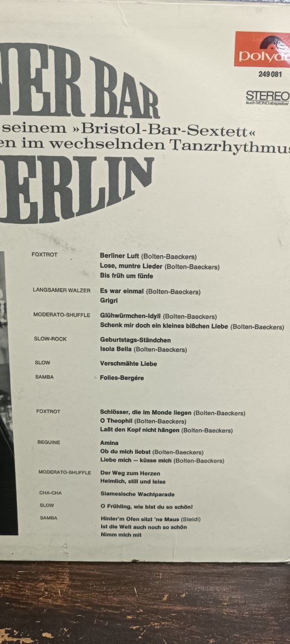 Ця платівка у виконанні ансамблю Bristol-Bar-Sextett пропонує легку танцювальну музику в різних ритмах — від фокстроту і вальсу до самби, ча-ча та бегуїну. Репертуар поєднує оригінальні композиції та популярні мелодії, створюючи атмосферу затишного бару чи танцювального вечора у Берліні середини ХХ століття. Це музика для невимушеного відпочинку та приємних вечірніх зустрічей.