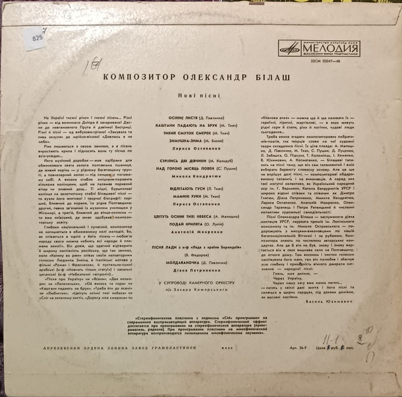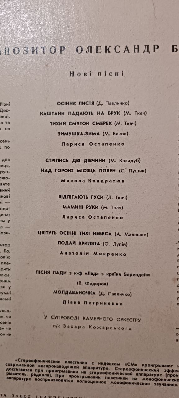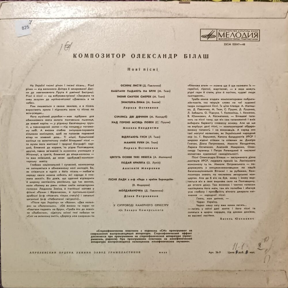 Вінілова платівка з новими піснями Олександра Білаша — одного з найвідоміших українських композиторів XX століття. Альбом поєднує ліричні, глибоко емоційні пісні на вірші відомих поетів, виконані провідними українськими співаками у супроводі камерного оркестру. Це щира українська естрадно-академічна музика з народною інтонацією, теплом і мелодійністю.
