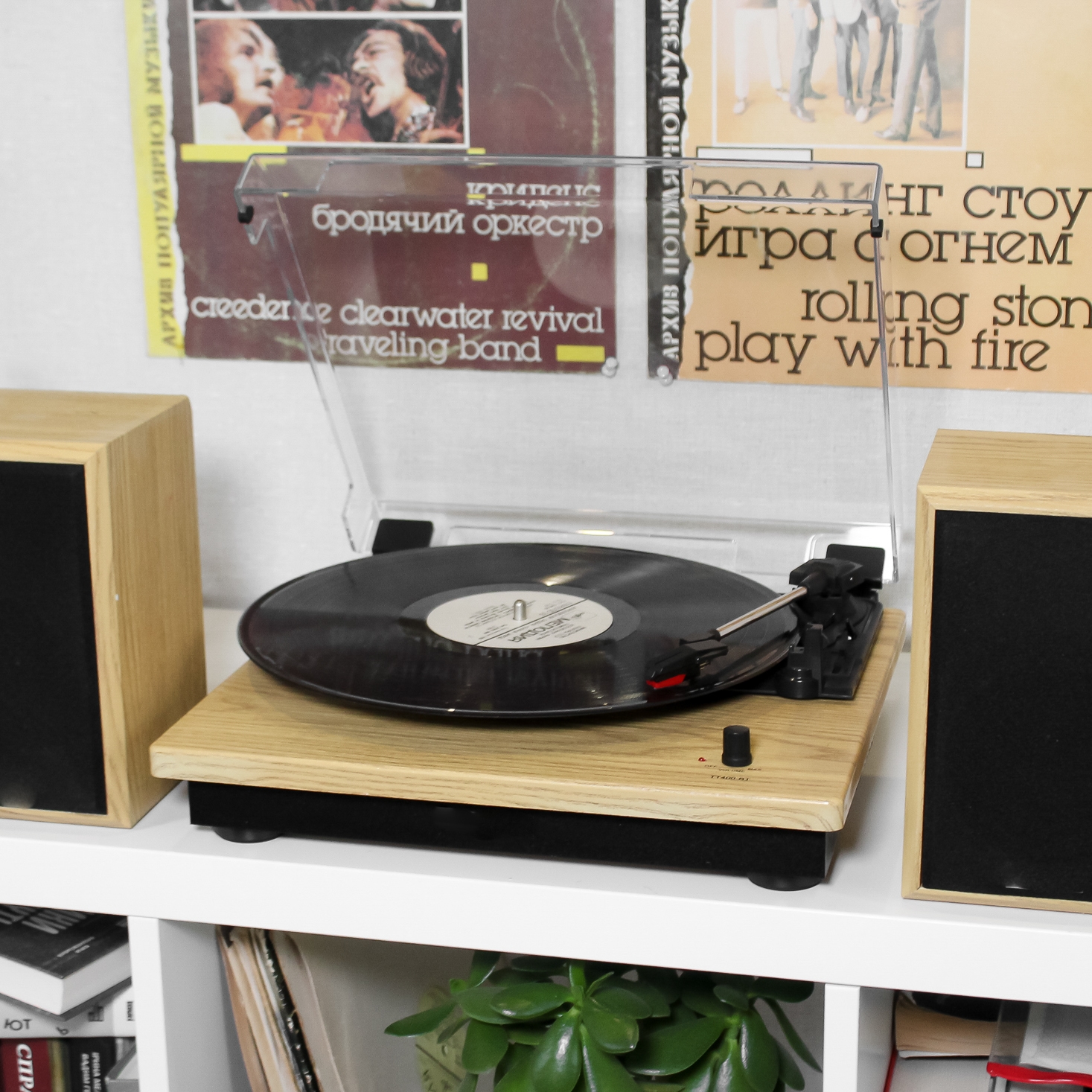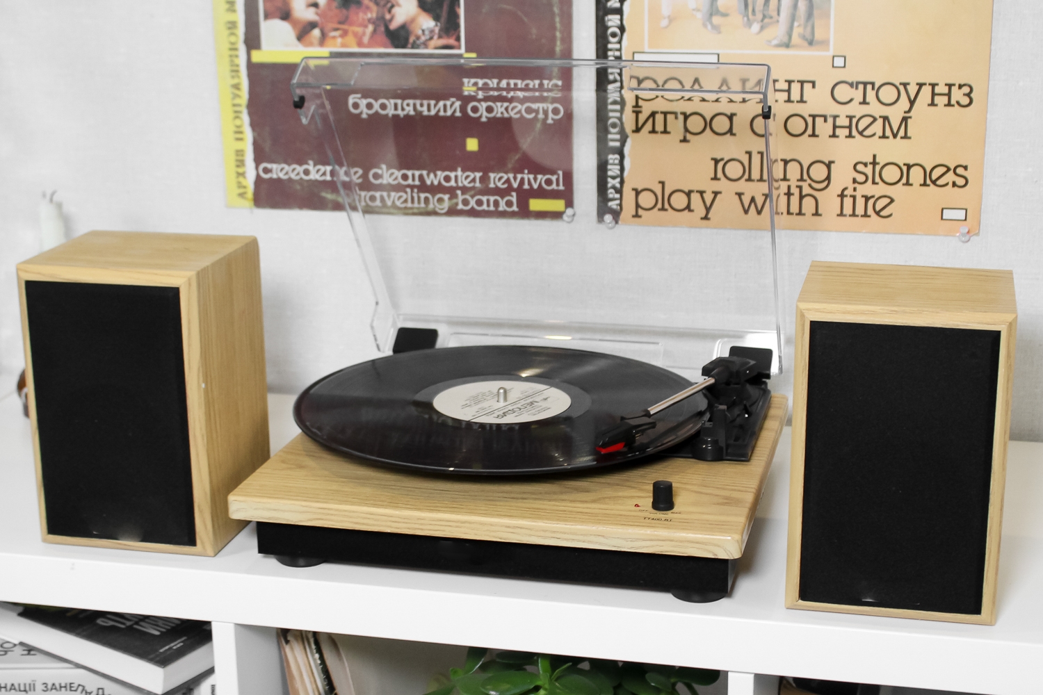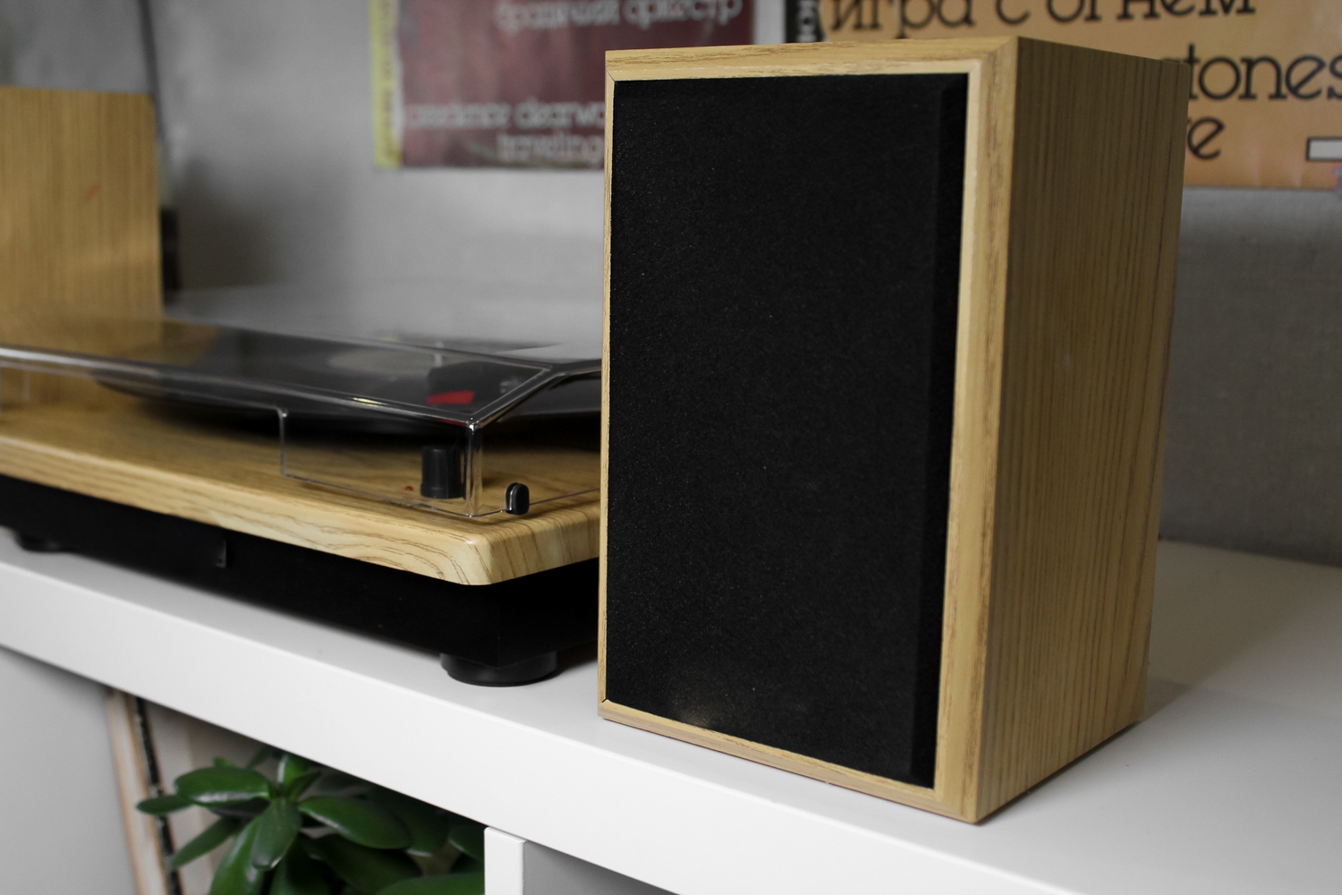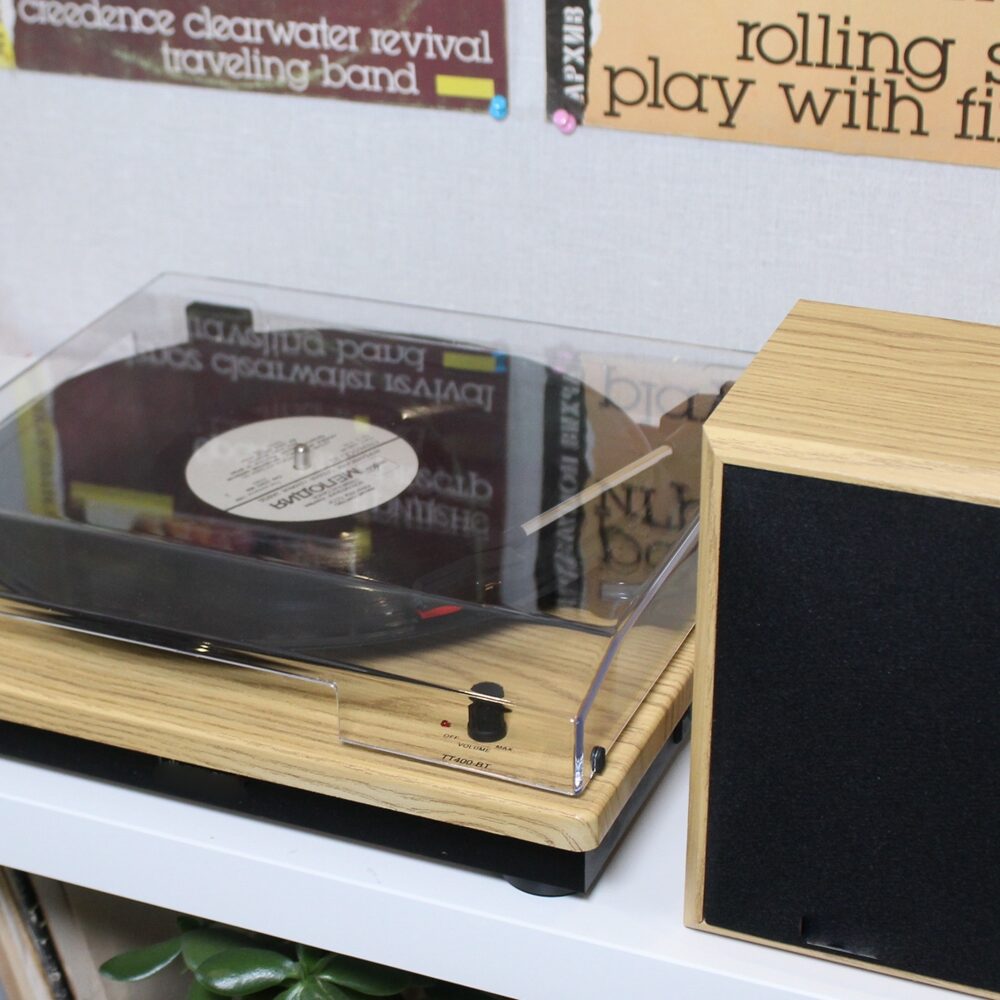 Класична модель програвача в кольорі світле дерево в комплекті з двома потужними динаміками.
