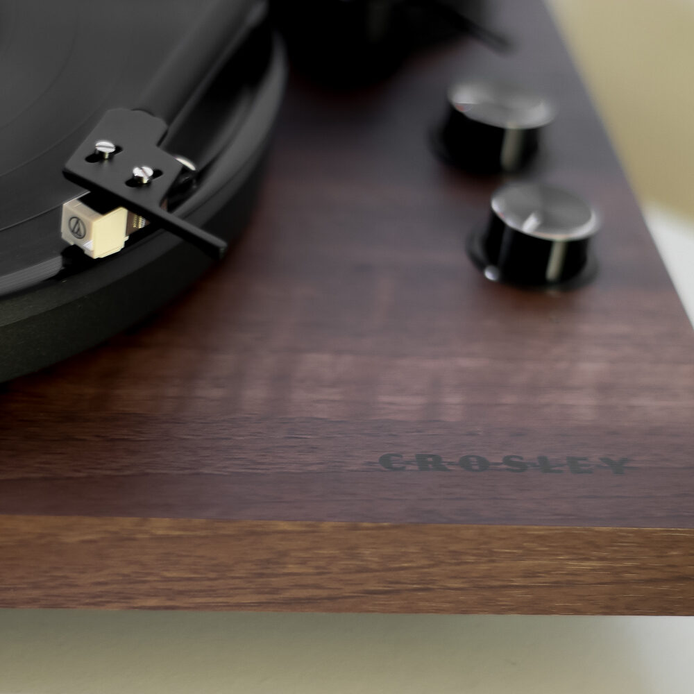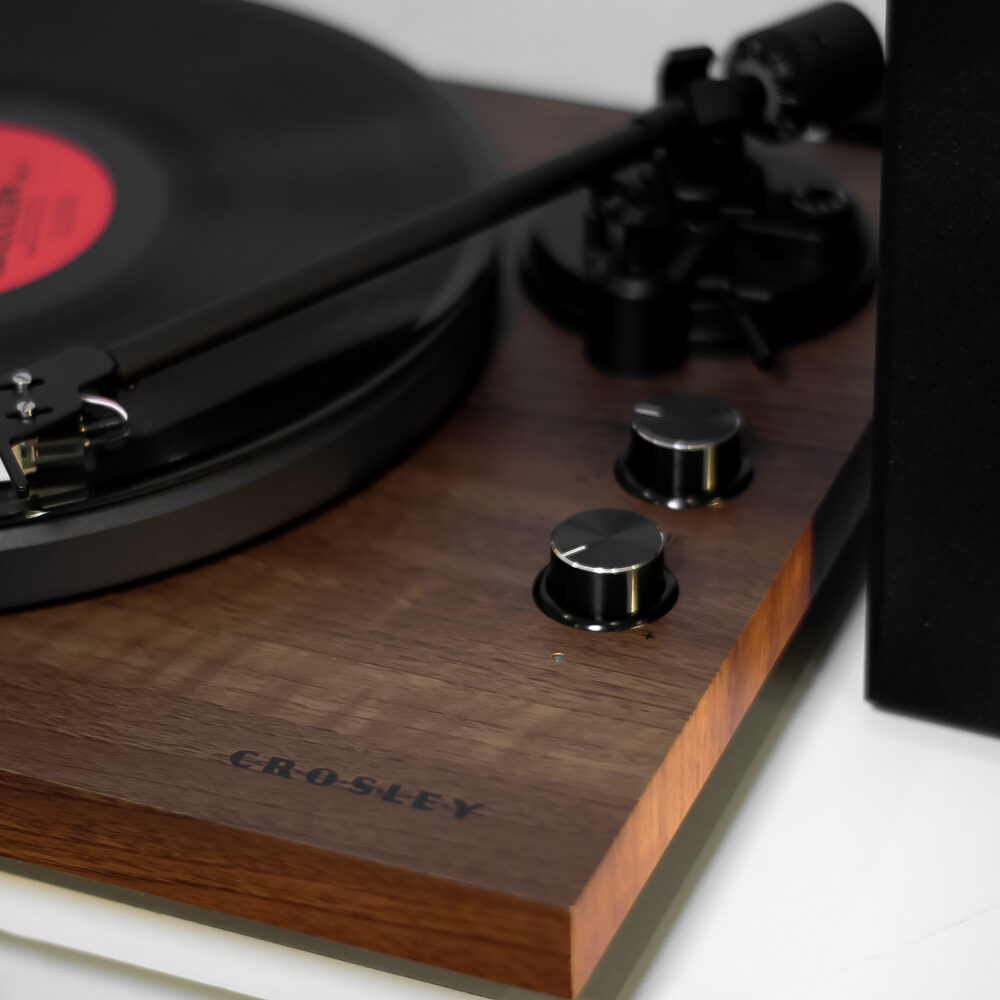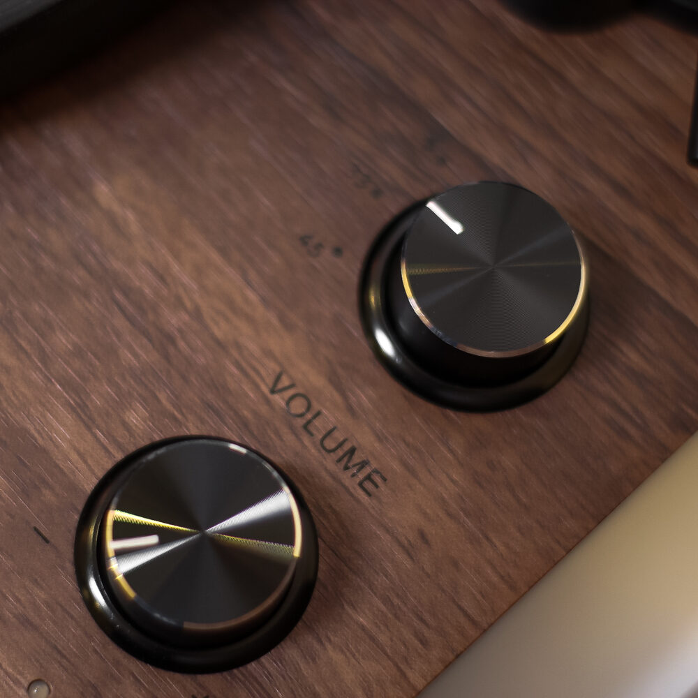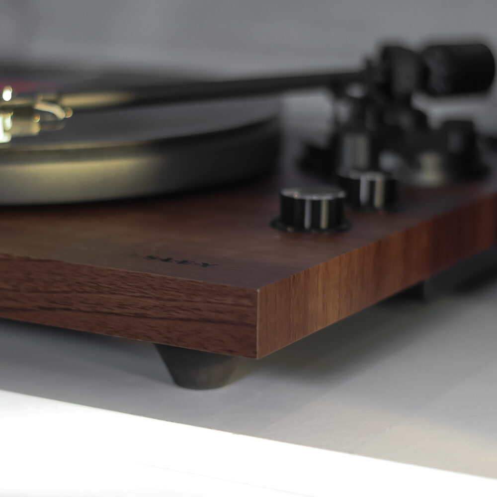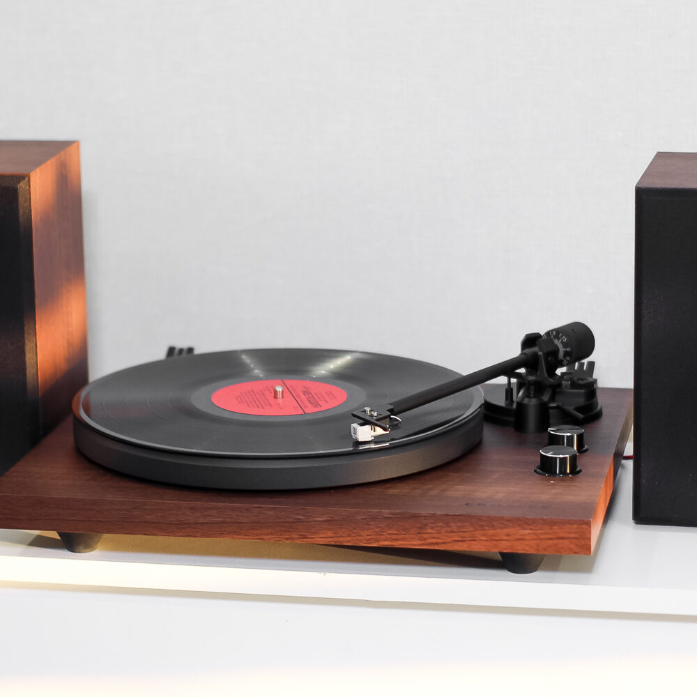 Класична модель програвача в кольорі Walnut в комплекті з двома потужними динаміками.