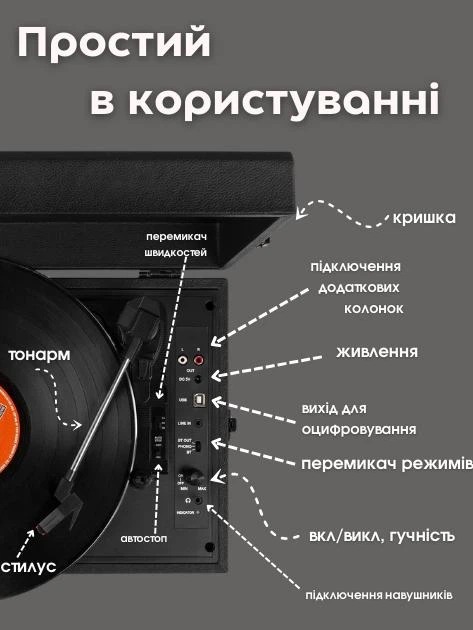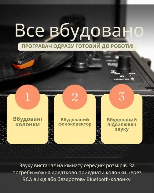 Програвач максимально забезпечений всім! Фонокорректор, підсилювач та колонки вже вбудовані, голка встановлена.