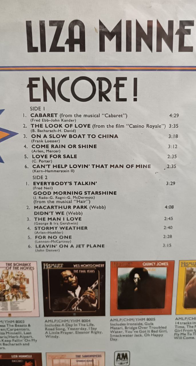 Encore! — яскравий концертний альбом легендарної співачки та акторки Лайзи Міннеллі. Платівка передає атмосферу живого виступу: емоційний вокал, театральність виконання та класичні композиції зі світу мюзиклів, кіно й популярної музики.