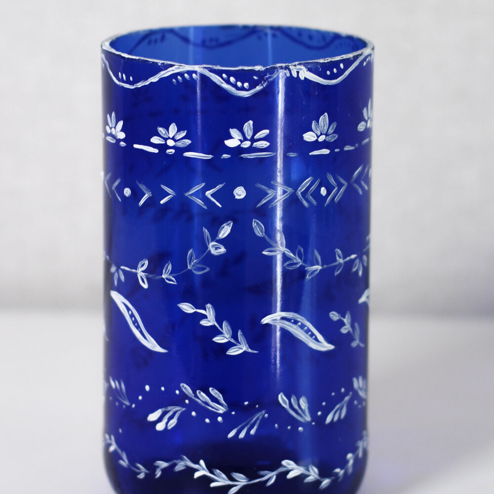 Виготовлена з обрізаної синьої скляної пляшки, ця ваза отримала нове життя завдяки апсайклінгу. Ніжний рослинний орнамент, нанесений вручну білою фарбою, створює стильний контраст та робить вазу унікальною.