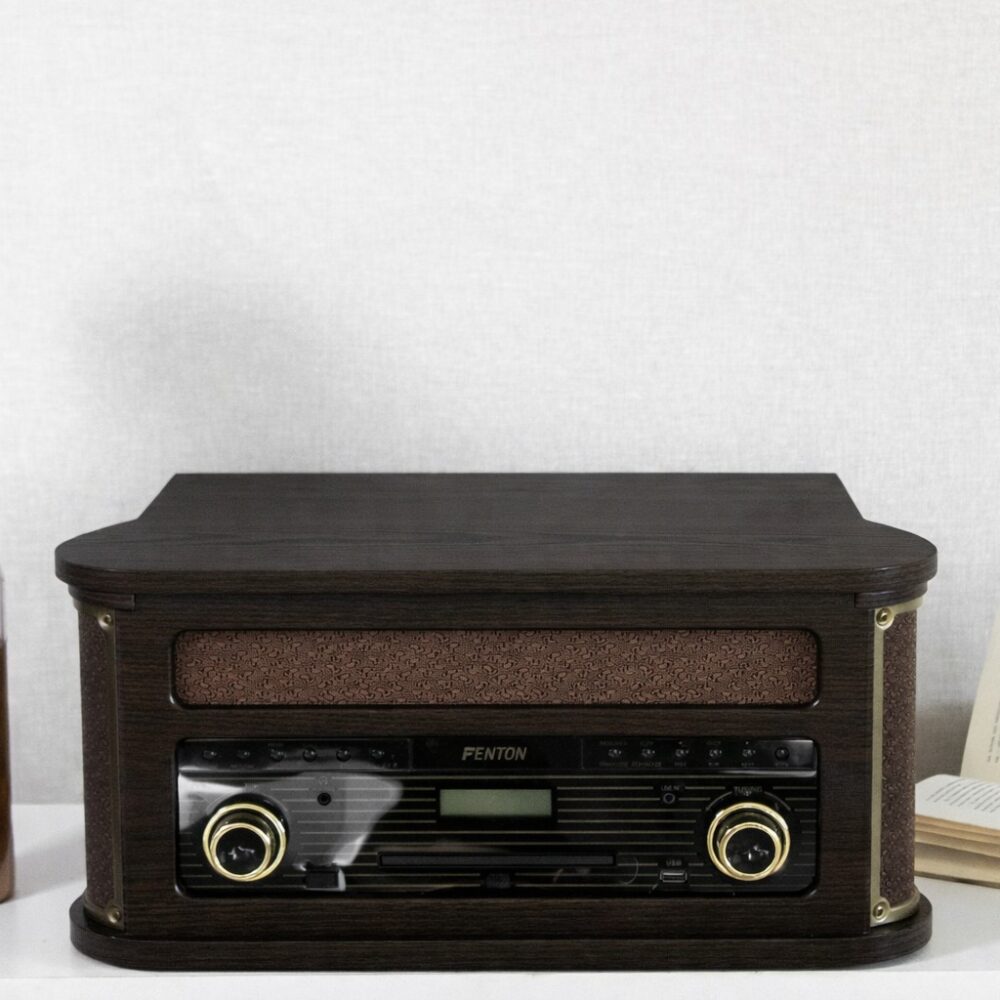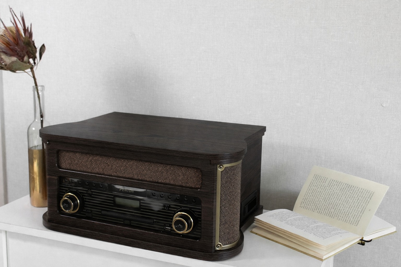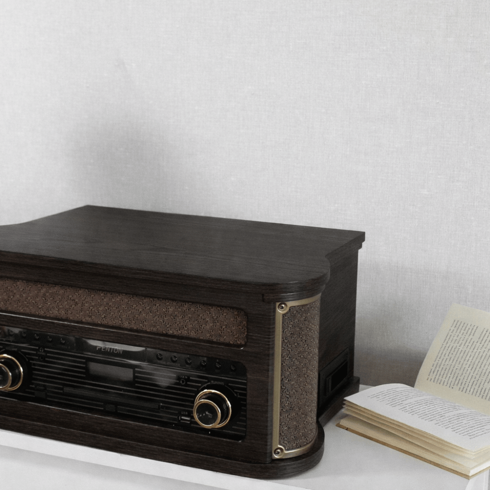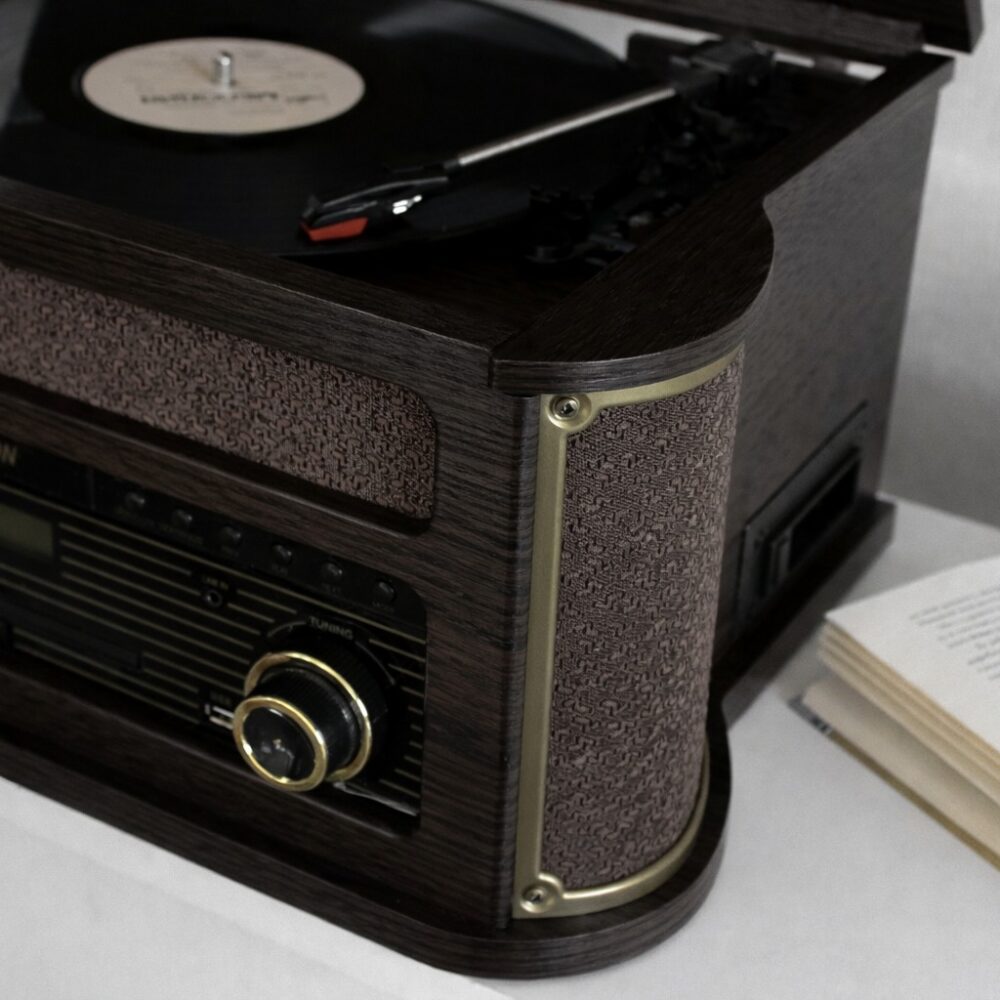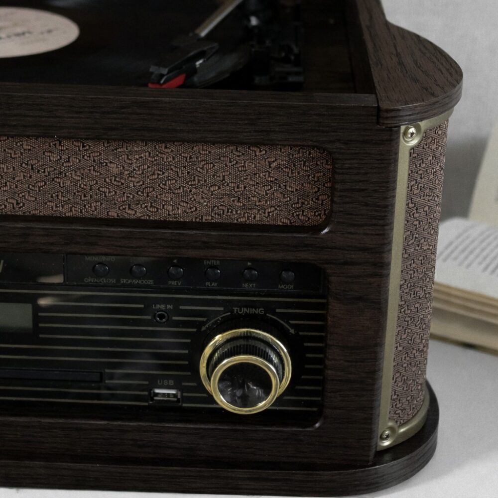 Стильний вініловий програвач у ретро-дизайні, виконаний у корпусі під світле дерево, що нагадує класичну аудіотехніку минулих десятиліть. Передня панель оздоблена декоративною тканиною динаміків та вінтажними елементами керування із золотистими ручками, що додає пристрою атмосферного характеру. Програвач має відкидну кришку для зручного доступу до платівки та захисту від пилу. Такий програвач не лише дозволяє насолоджуватися улюбленими платівками, а й виглядає як стильний елемент інтер’єру, який чудово доповнить будь-який простір.