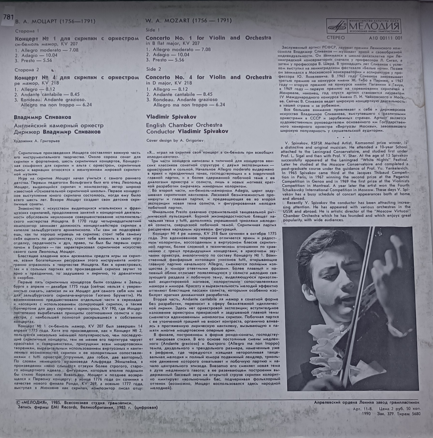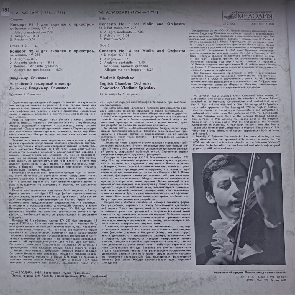 Side 1 — Concerto No. 1 for Violin and Orchestra in B flat major, KV 207