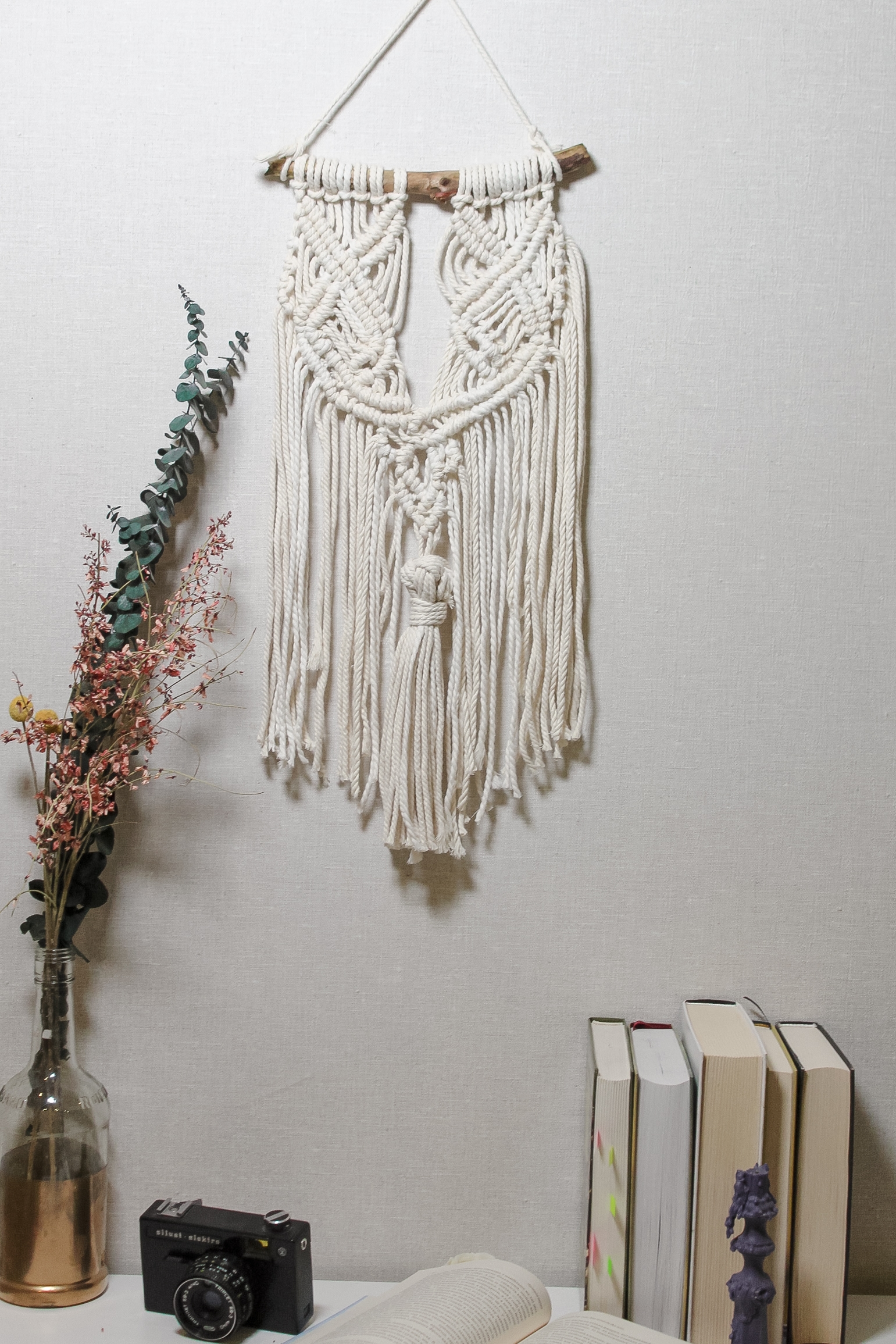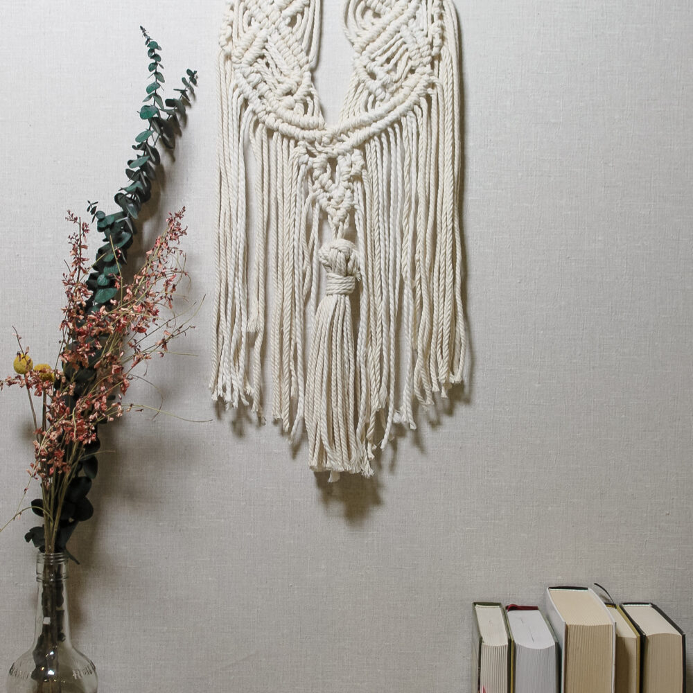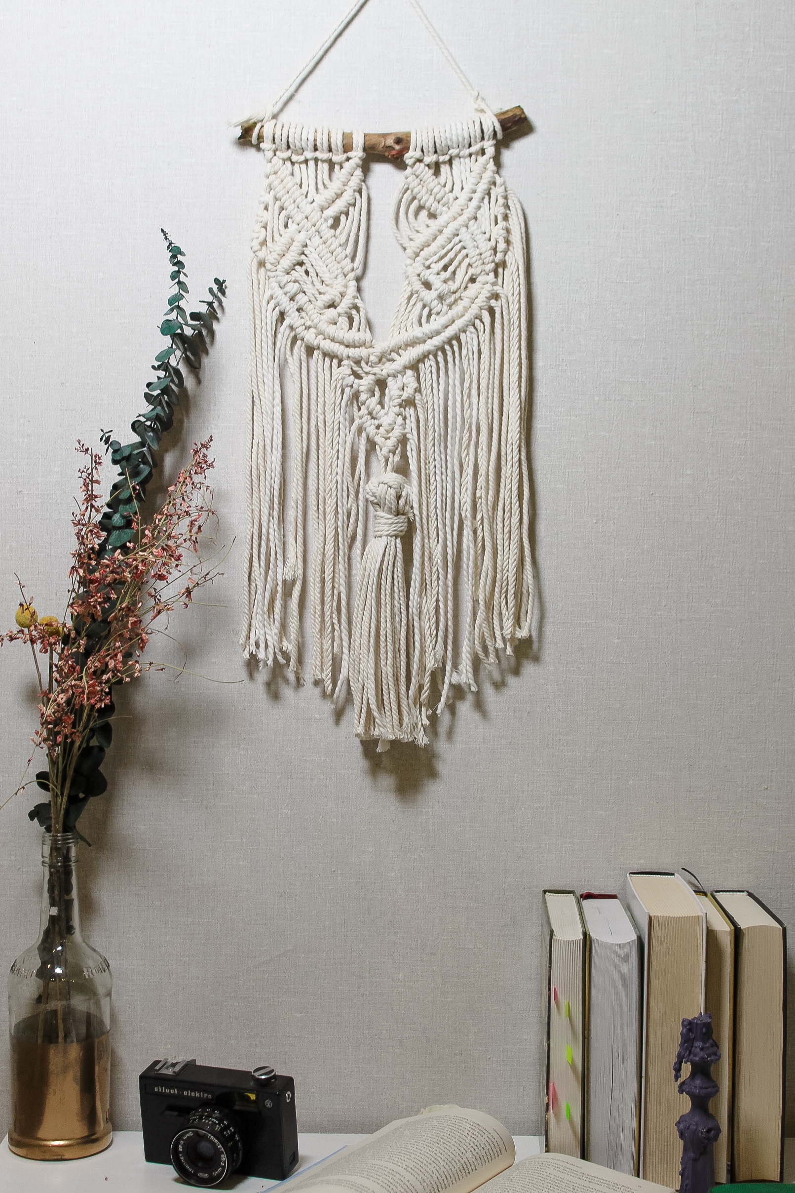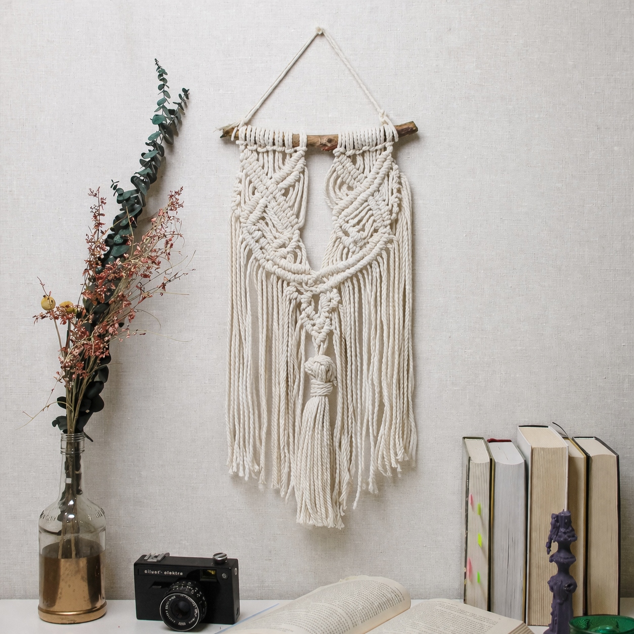 Настінне макраме ручної роботи з натурального бавовняного шнура на дерев’яній гілці. Лаконічне плетіння з довгими шнурами створює спокійний boho-настрій і додає інтер’єру тепла та текстури. Ідеально підходить для спальні, вітальні або затишного куточка для відпочинку.