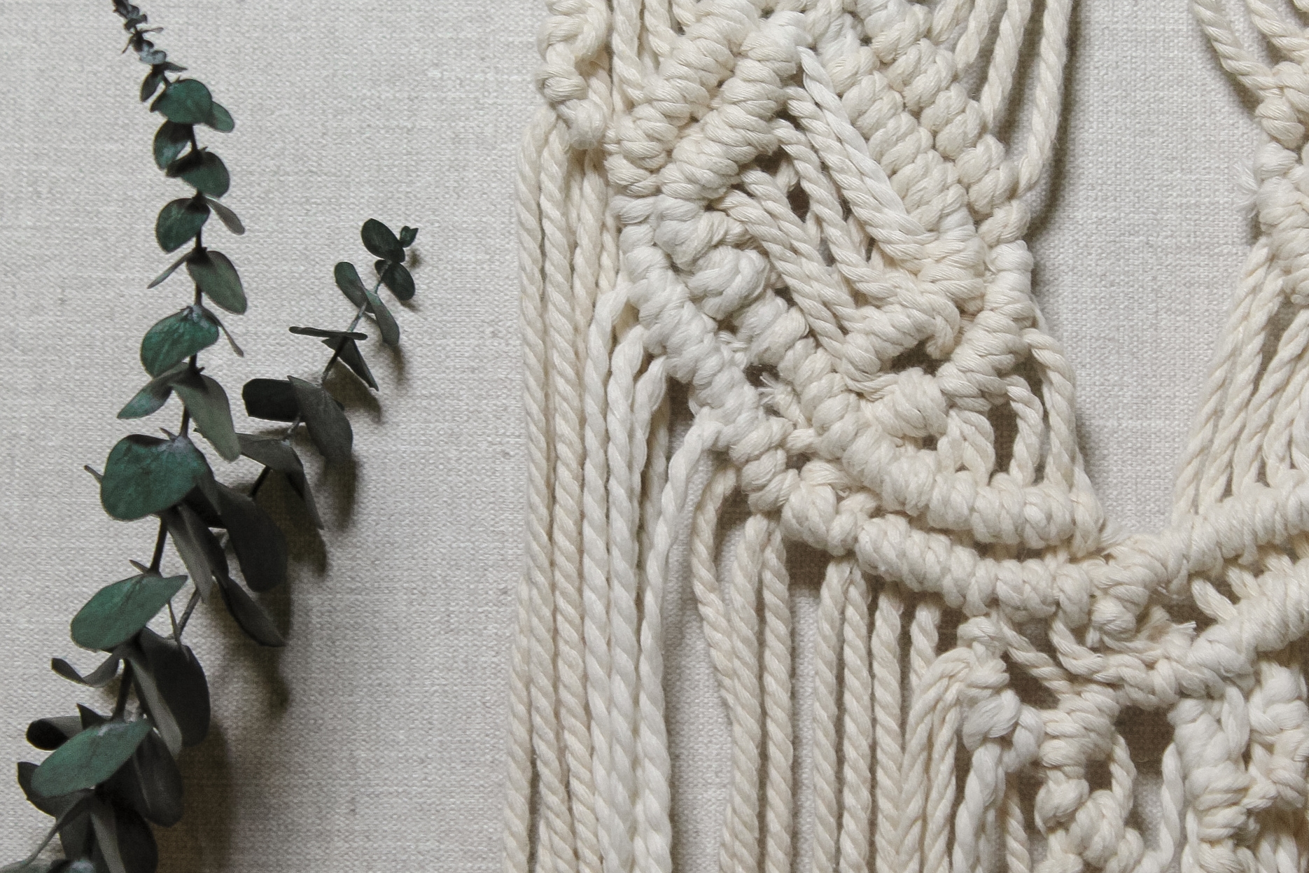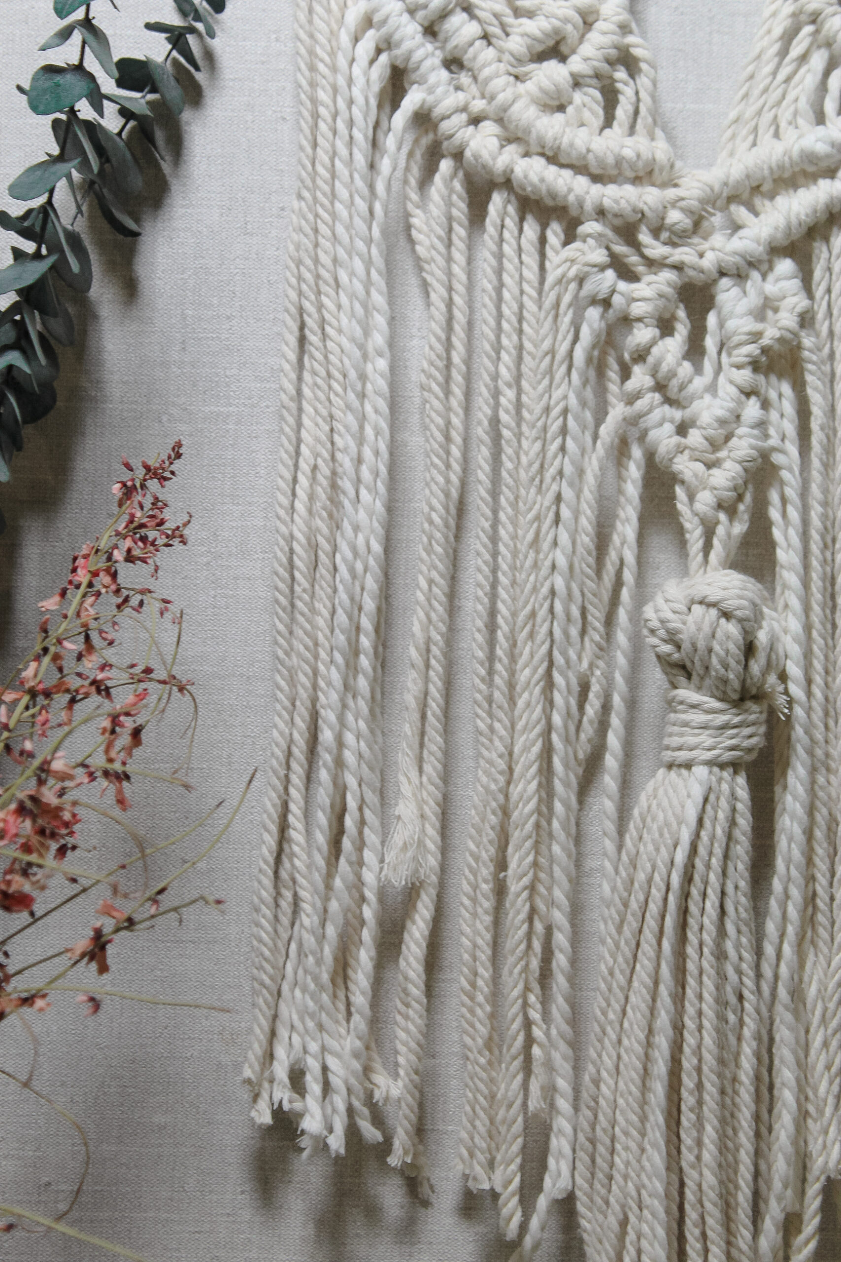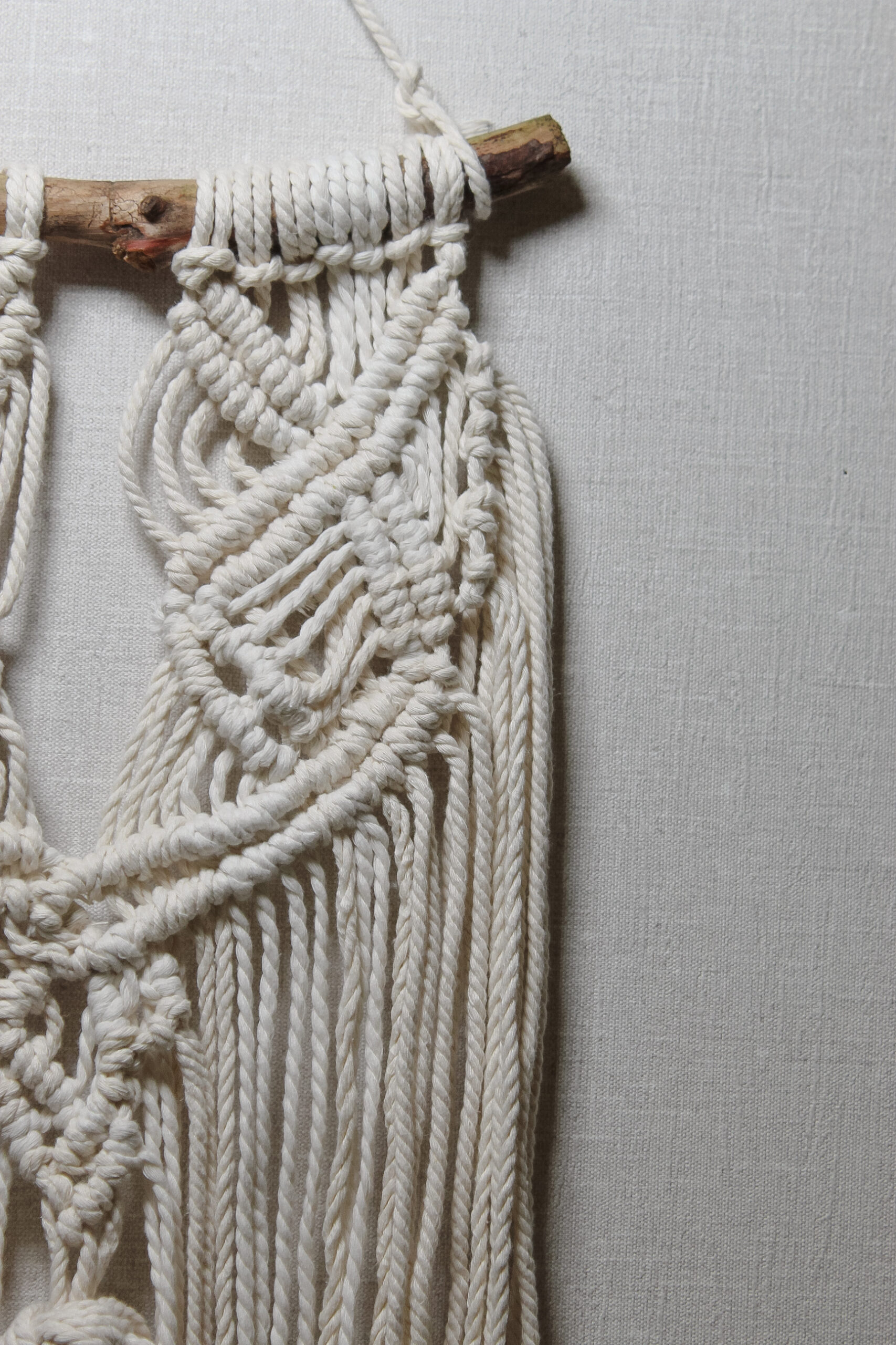 Настінне макраме ручної роботи з натурального бавовняного шнура на дерев’яній гілці. Лаконічне плетіння з довгими шнурами створює спокійний boho-настрій і додає інтер’єру тепла та текстури. Ідеально підходить для спальні, вітальні або затишного куточка для відпочинку.