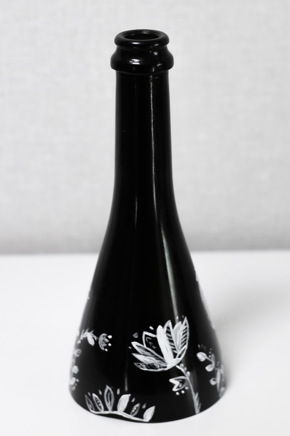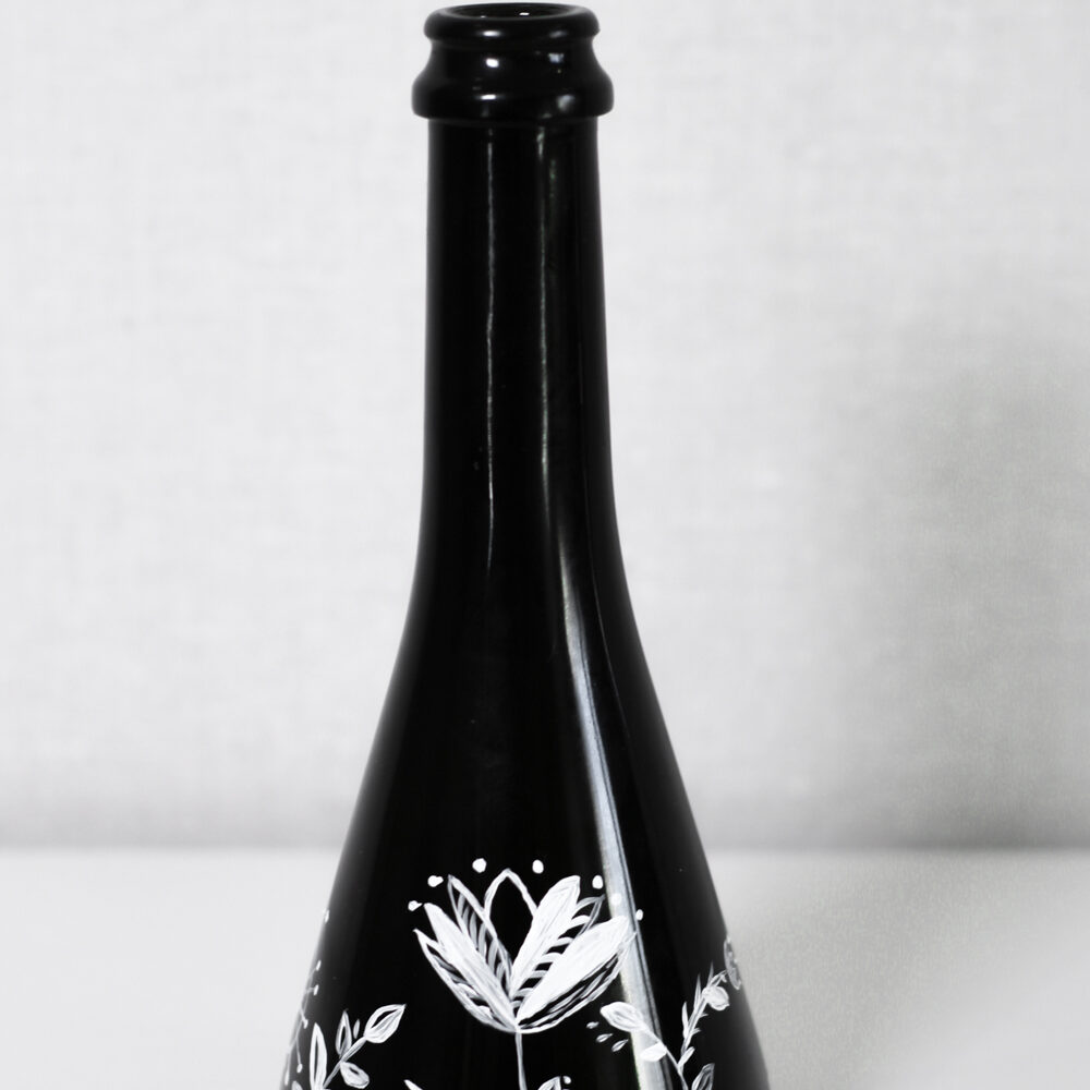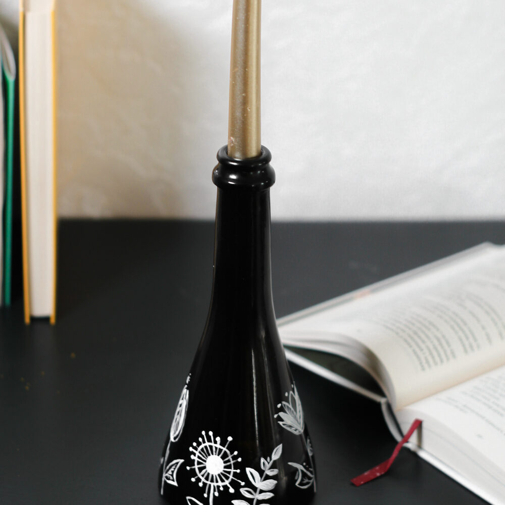 Стильний підсвічник, створений з переробленої скляної пляшки та розписаний вручну білим візерунком. Контраст темного скла та ніжних рослинних мотивів робить його універсальним акцентом для будь-якого інтер’єру.
