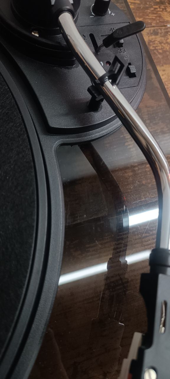 Класичний програвач у прозоому корпусі. В комплекті з фірмовим сліпматом. Програвач не має вбудованих колонок і потребує приєднання до аудіосистеми.