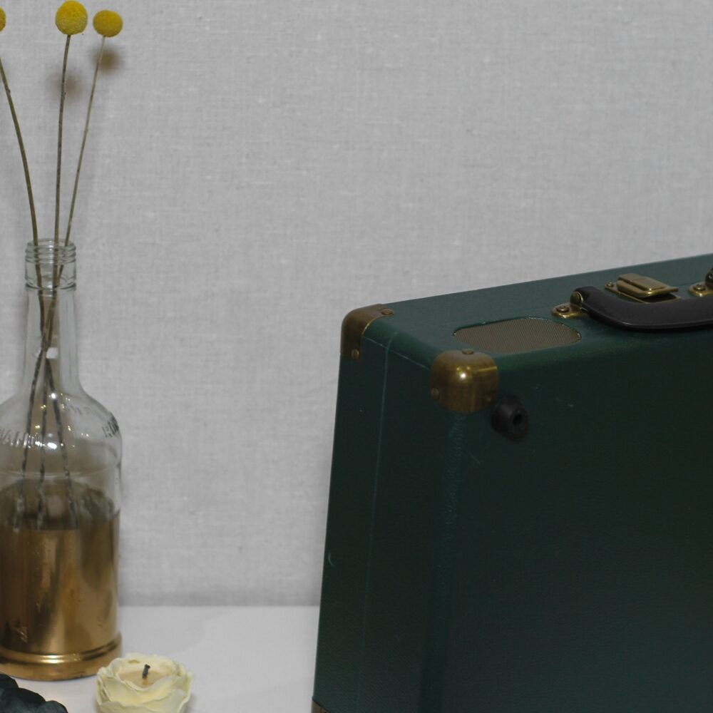 Ретро-валізка в насиченому зеленому кольорі з мідною фурнітурою.