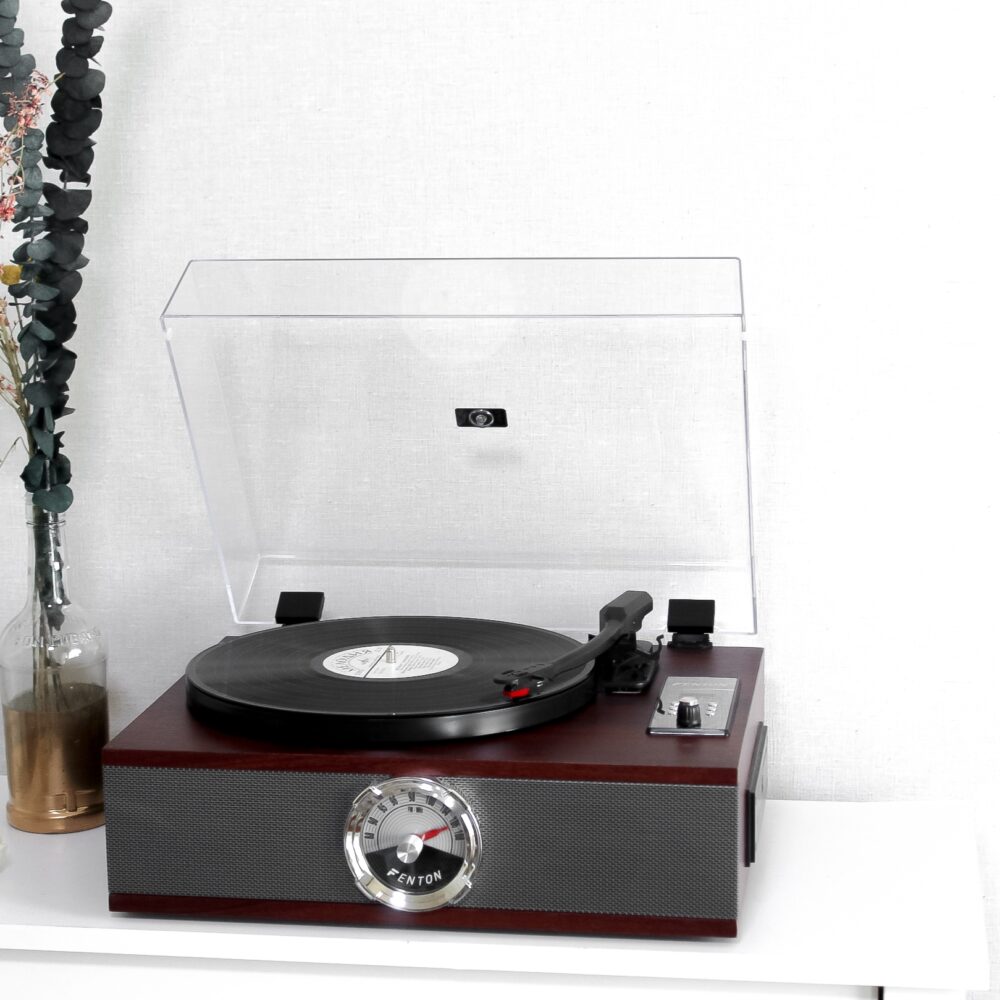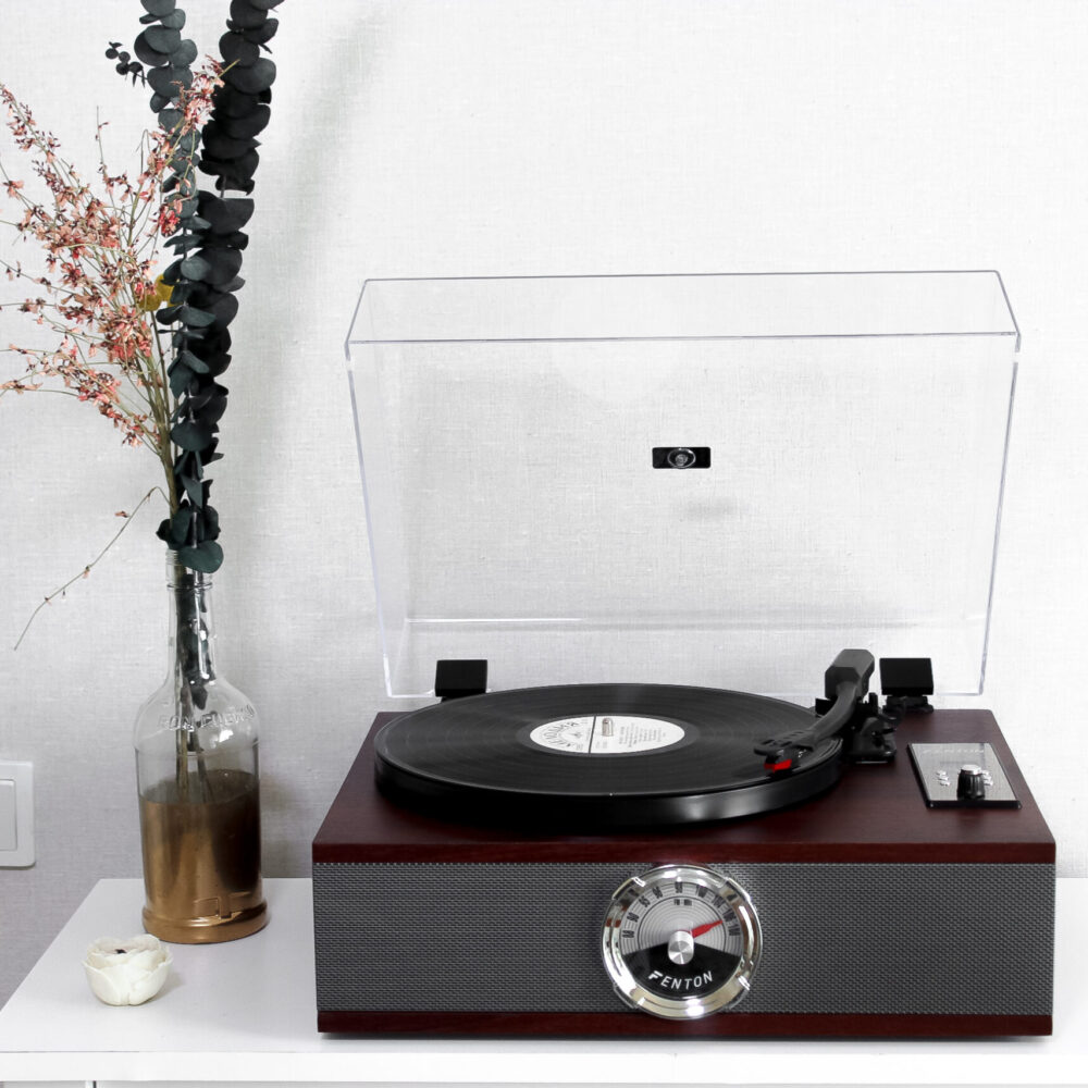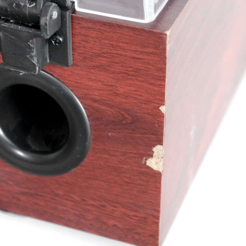 Стильний вініловий програвач у вінтажному дизайні, який поєднує класичну атмосферу аналогової техніки та сучасну багатофункціональність. Корпус у глибокому дерев’яному відтінку доповнений металевою передньою панеллю з оригінальним круглим індикатором у ретро-стилі, що робить програвач не лише джерелом музики, а й ефектним елементом інтер’єру.