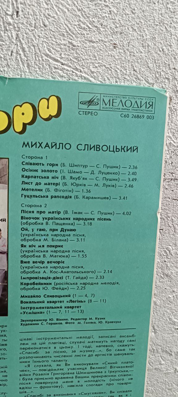 Вінілова платівка Співають Гори – Михайло Сливоцький, вокальний квартер “Легінь”, інструментальний квартет “Усмішка” – NM