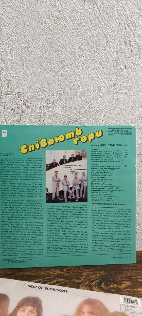 Вінілова платівка «Співають гори» (Мелодія, 1983) — це музична збірка, що поєднує українські народні мотиви та сучасну естрадну обробку. Виконавці — Михайло Сливочкій, вокальний квартет «Львів» та інструментальний ансамбль «Арніка». У платівці звучать пісні, натхненні красою Карпат, життям і побутом гуцулів, а також сучасні твори відомих українських композиторів.