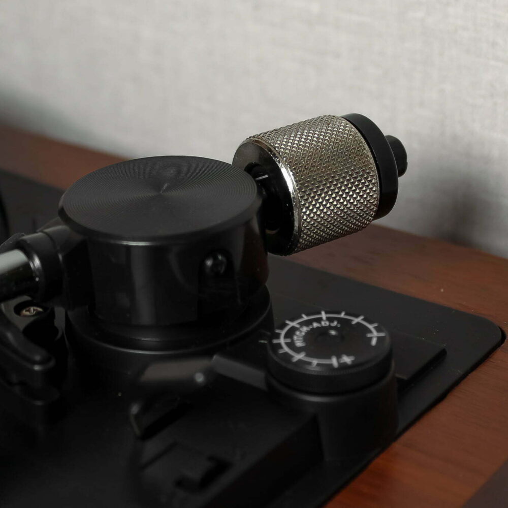 Класичний програвач з вигнутим тонармом, важелем натиску тонарма, плавним регулюванням швидкості.