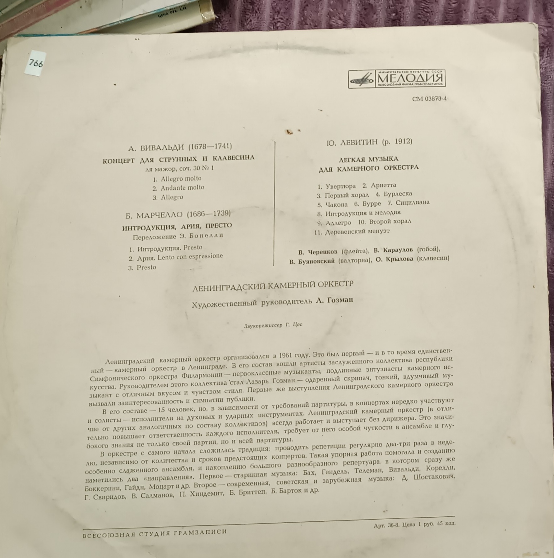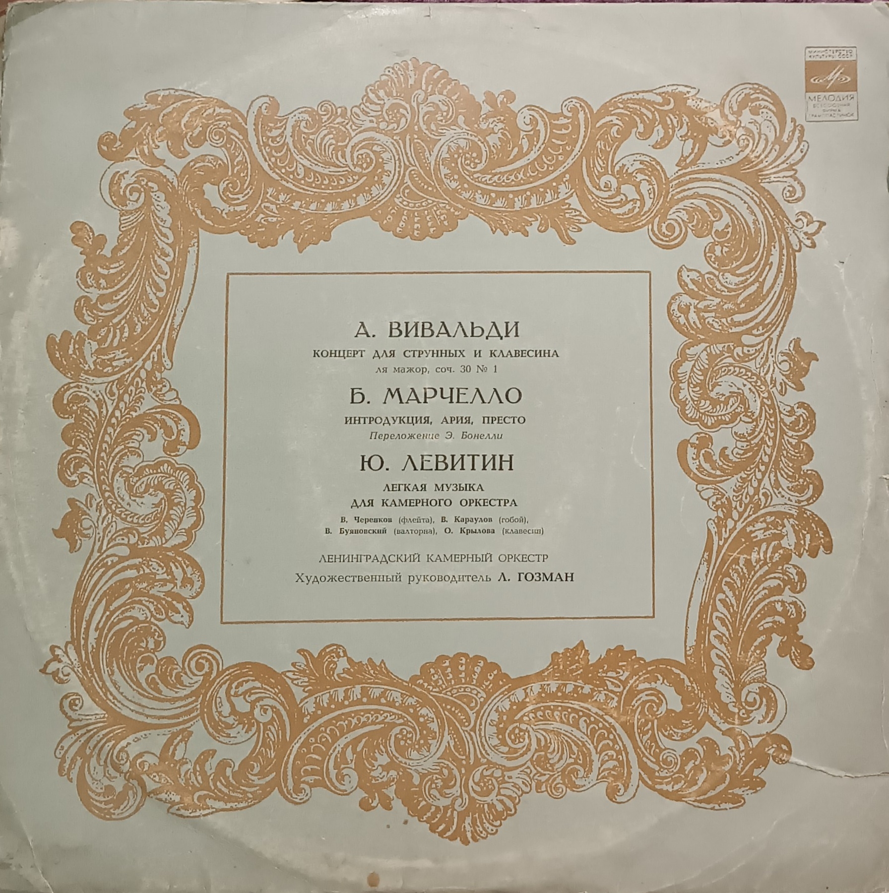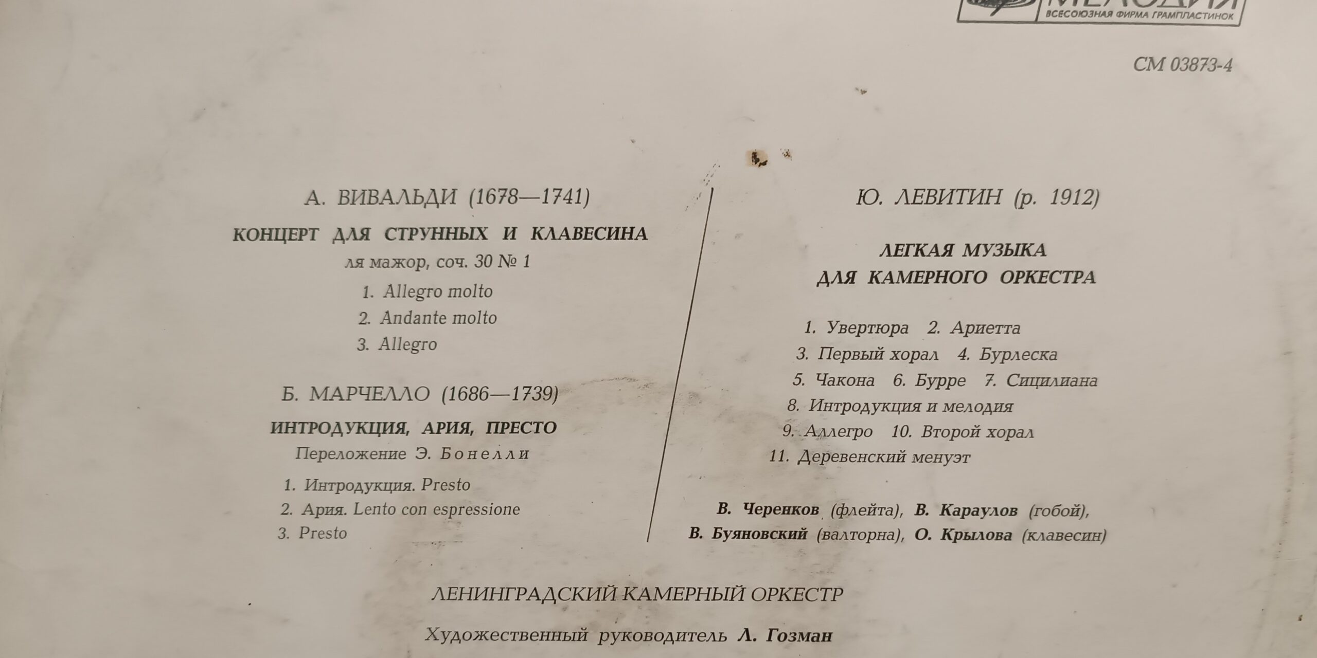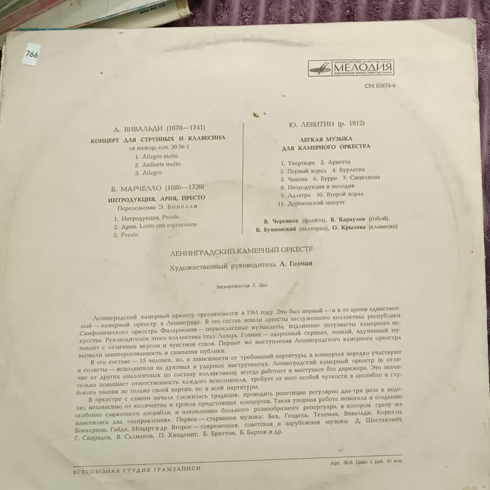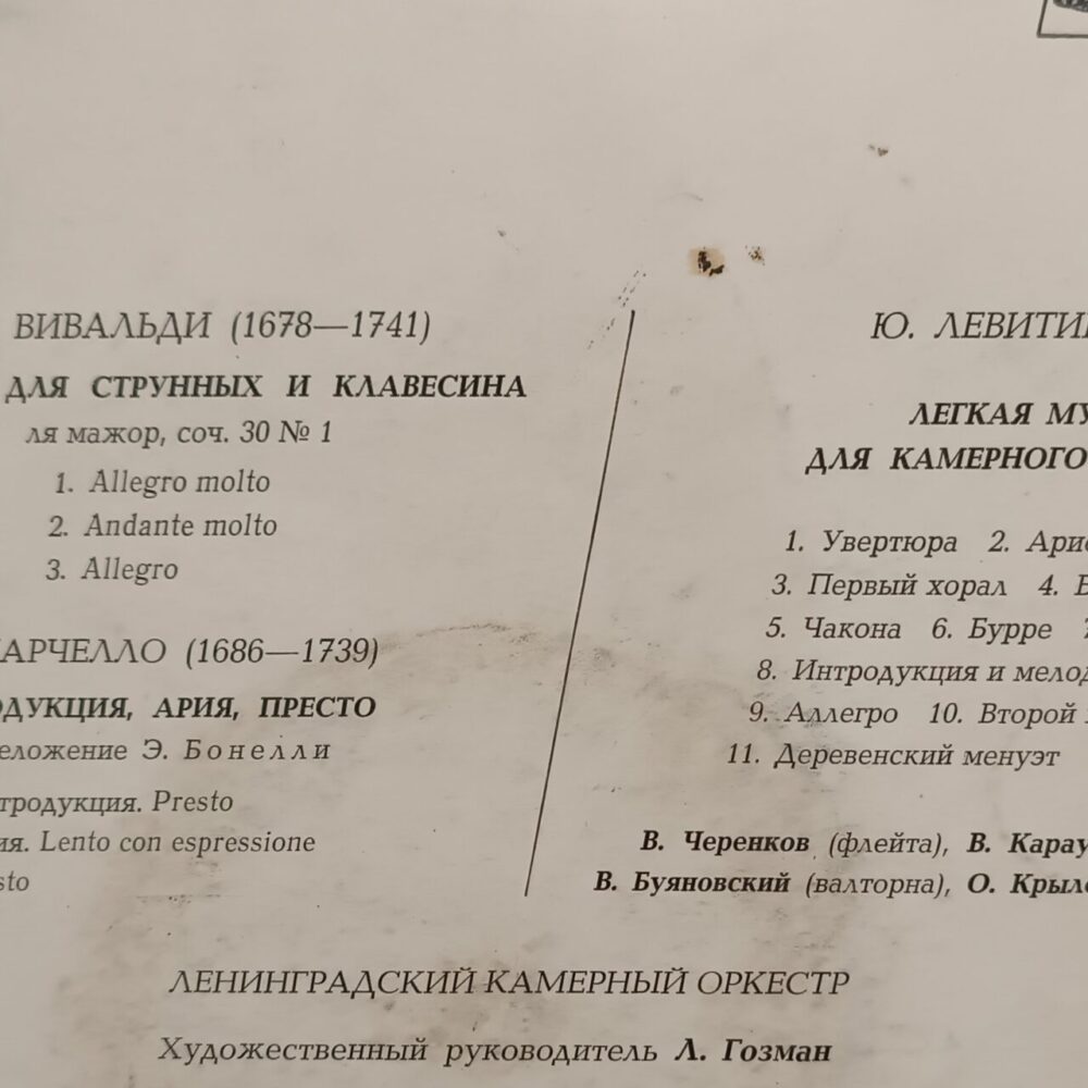 Ця платівка для поціновувачів класичної музики та камерного звучання: тут поєднані барокові твори Вівальді й Марчелло та більш сучасна, легка за настроєм музика Юрія Левітіна. Гарний вибір для спокійного вечірнього прослуховування, домашньої колекції класики та знайомства з камерним оркестром у вінтажному виконанні.