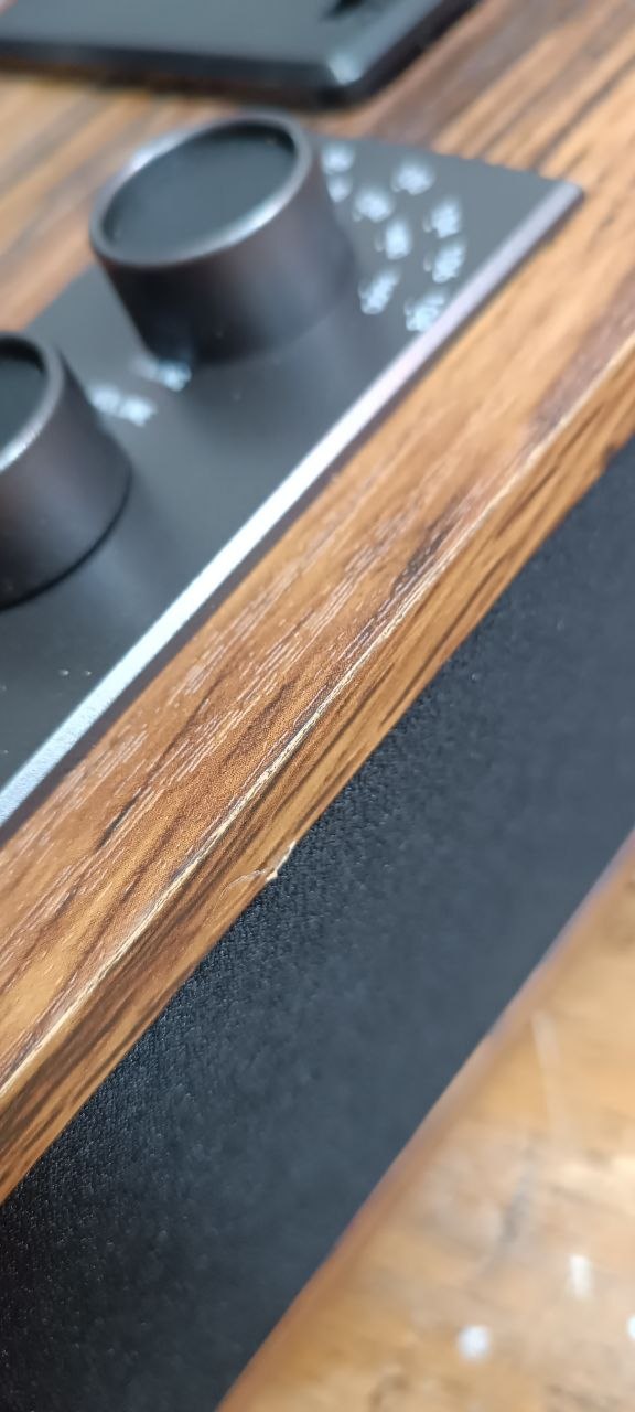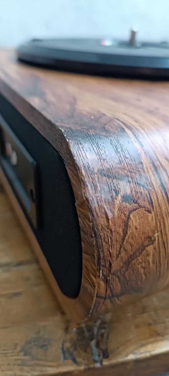Компактний програвач з заокругленими краями в дерев’яному корпусі, з додатково вбудованим радіо FM та Bluetooth.