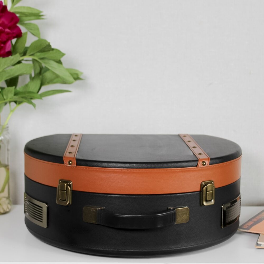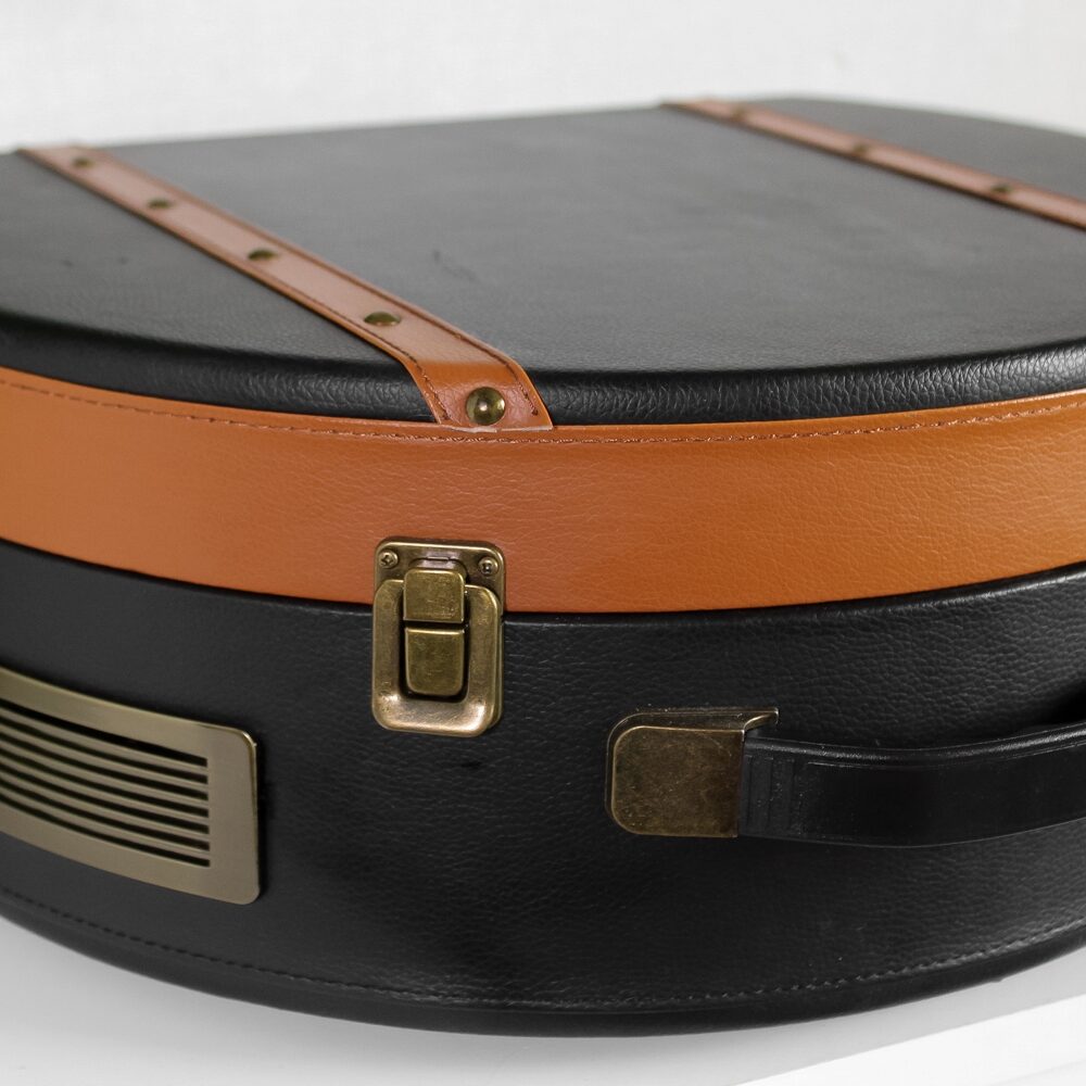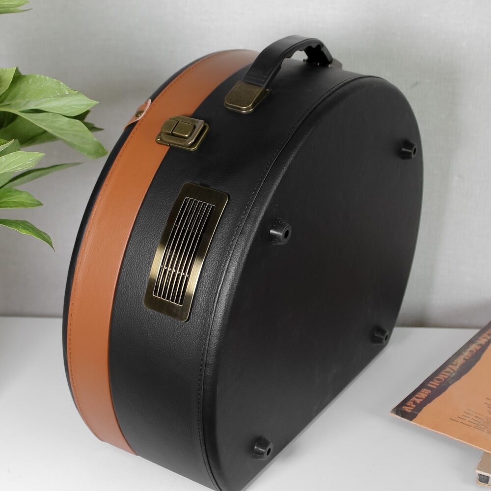 Ретро-валізка в чорному кольорі з коричневими ремінцями.